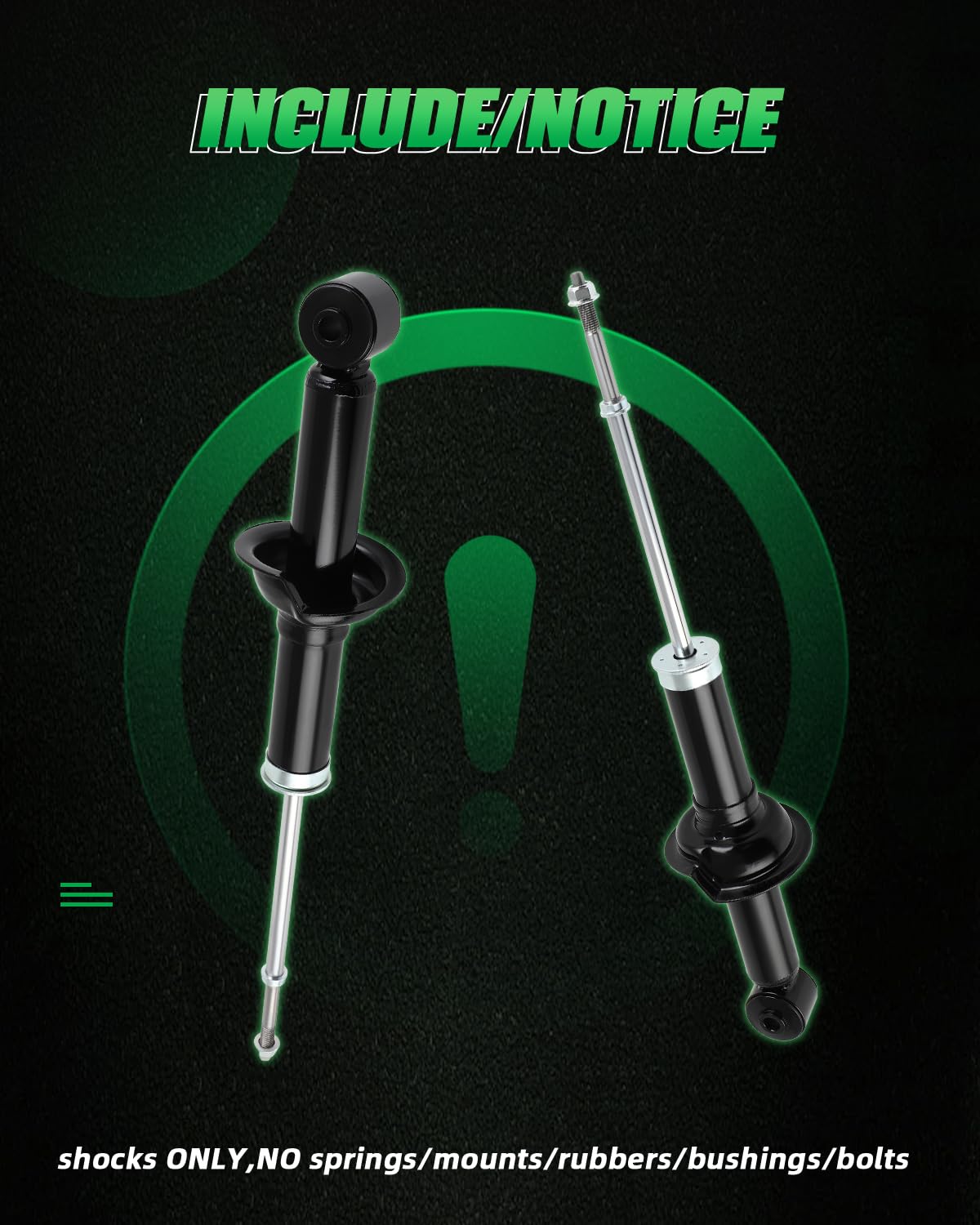 Q: Are the SCITOO rear shock absorbers sold as a complete set?A: Yes, the SCITOO rear shock absorbers are sold as a set of two, designed for both the driver and passenger sides. Please note that this set includes shocks only and does not come with springs, mounts, rubbers, or bolts.
