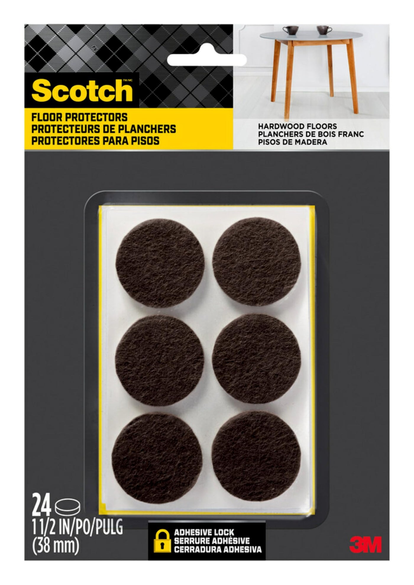Q: What size are the Scotch Felt Pads and how many come in a pack?A: Each Scotch Felt Pad has a diameter of 1.5 inches, and they are sold in packs of 24 pads, making them a convenient option for protecting multiple pieces of furniture.