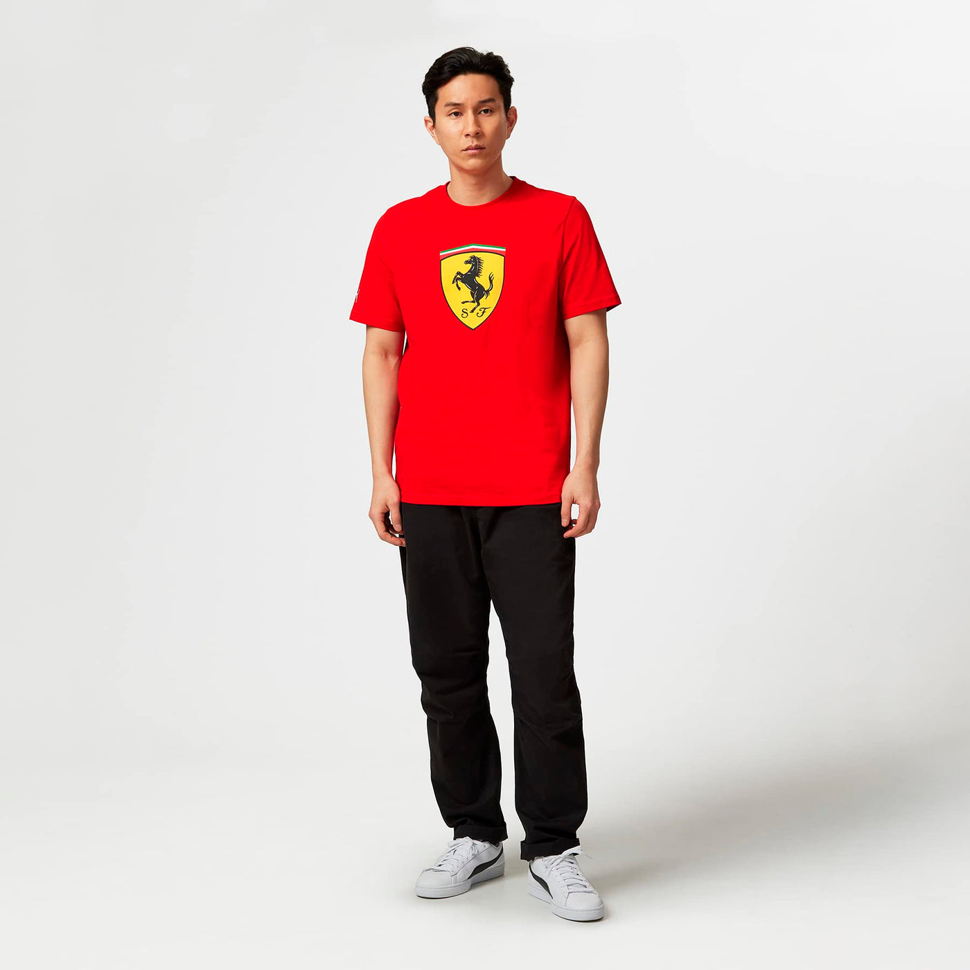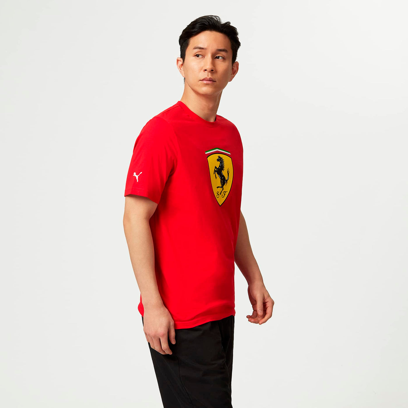 Q: Does the T-Shirt have any logos or branding?A: Yes, the T-Shirt features a large Scuderia Ferrari logo on the front and a small Puma cat logo on the sleeve, adding to its stylish appeal.
