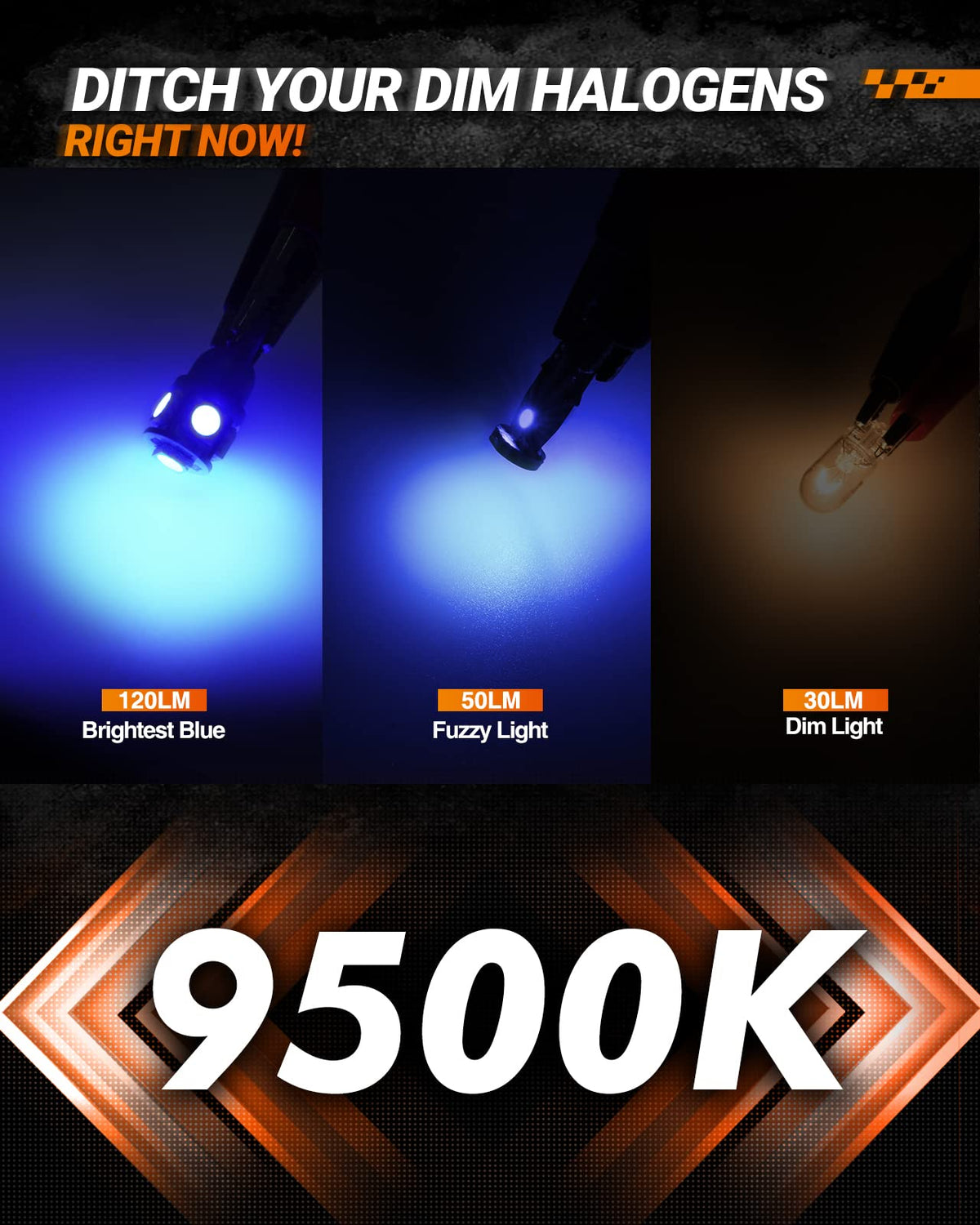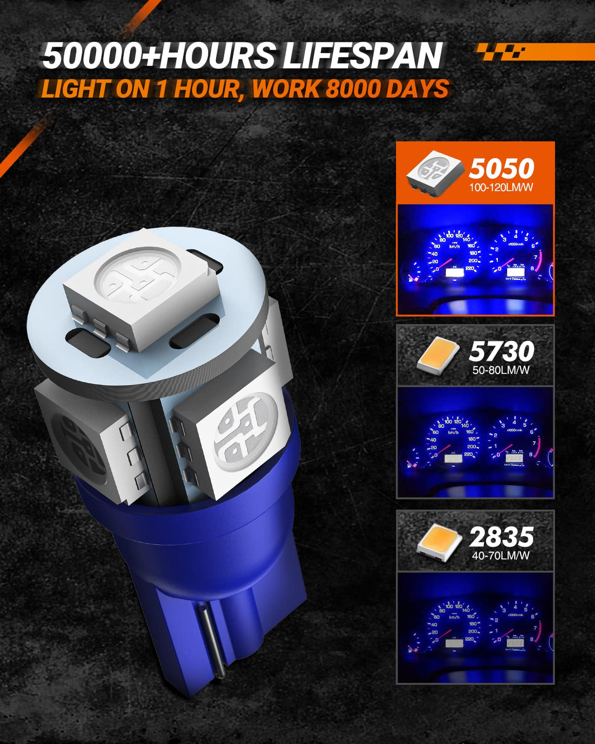 ?200% Brighter Than Halogen Bulb?Sealight 194 Led Bulb Own 5-Pcs Smd Chips 300Lm Light Output Per Bulb, Which Means Not Only 200% Brighter Than Halogens, But Also Provides Sufficient Supplementary Lighting | ?Fit Bulb Size?T10/147/152/158/159/161/168/175/184/192/193/194/2825/W5W. Suitable Locations Include Dash Board Light License Plate Light, Map Light, Dome Light, Door Light, Trunk Light, Courtesy Light. | ?1 To 1 Replacement Design? The Sealed Light Bulb Is Designed With Reference To Halogen Lamps, Achieving The Same Luminous Positions And A Perfect Fit With A Wedge-Shaped Base. No Polarity, Plug And Play, Can Be Installed In 5 Minutes. | ?50,000 Hours Lifespan?Adopt Premium 5050 Led, And Whole Aluminum Body For Efficient Cooling, Ensuring 2825 Led Bulb 50,000 Hrs Of Continuous Light. Can Last For 10-Years Even If You Drive For 2 Hours Every Day | ?Attention?One Package Contains 10 194 Led Bulbs. For Certain Vehicles, A Canbus Decoder May Be Required To Fix Flickering Or Error Codes.