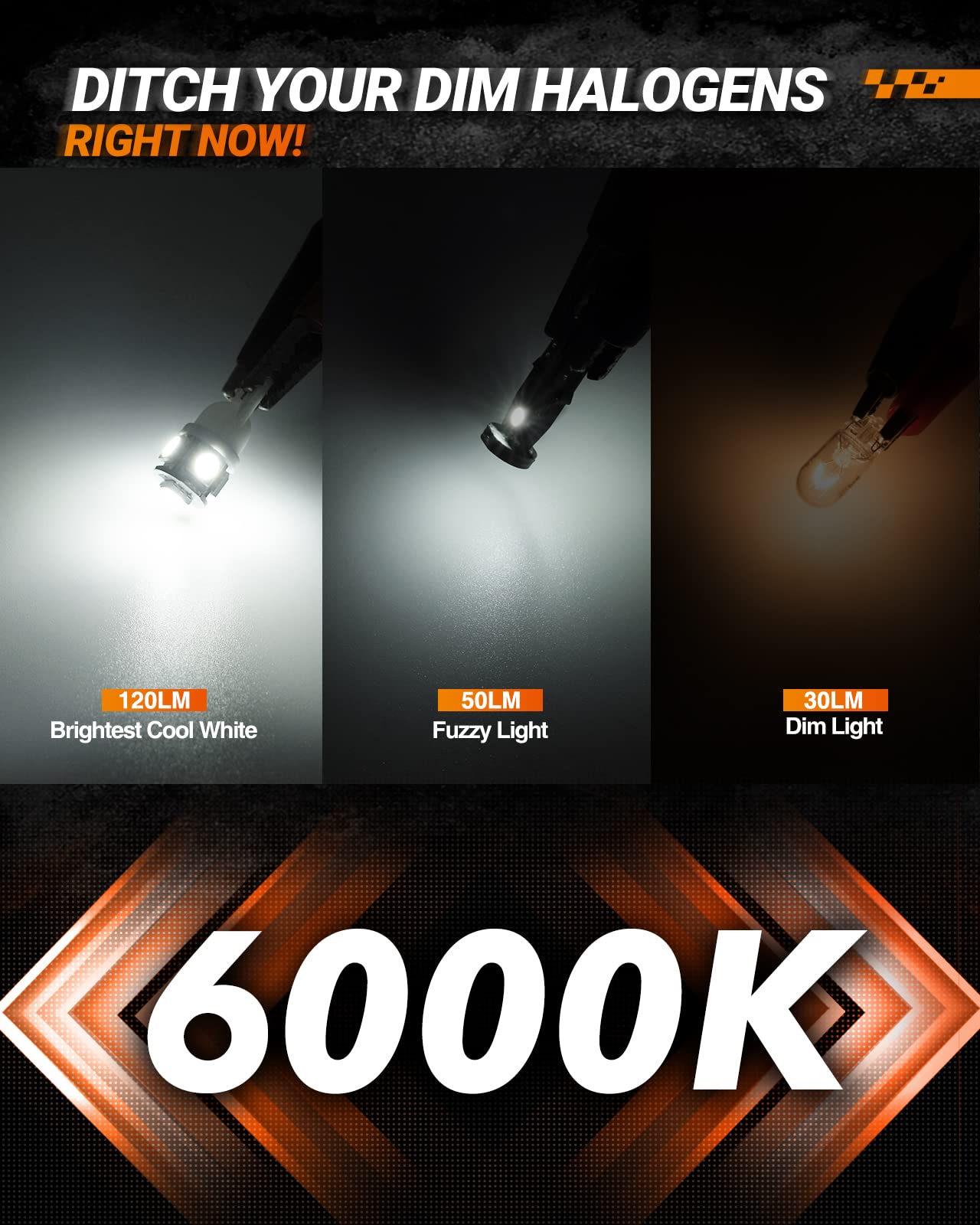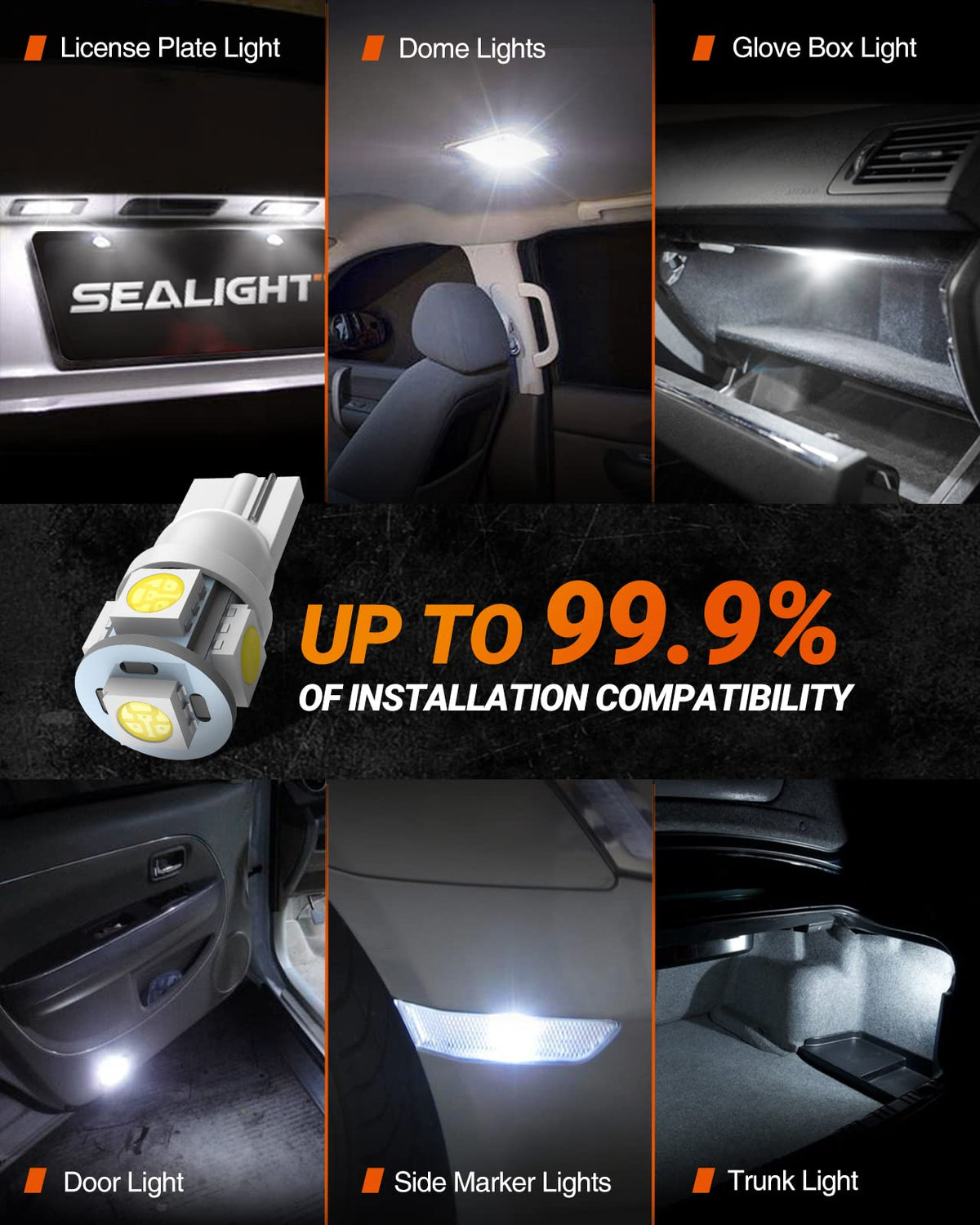 ?200% Brighter Than Halogen Bulb?Sealight 194 Led Bulb Own 5-Pcs Smd Chips 300Lm Light Output Per Bulb, Which Means Not Only 200% Brighter Than Halogens, But Also Provides Sufficient Supplementary Lighting | ?Fit Bulb Size?T10/147/152/158/159/161/168/175/184/192/193/194/2825/W5W. Suitable Locations Include License Plate Light, Map Light, Dome Light, Door Light, Trunk Light, Courtesy Light. | ?1 To 1 Replacement Design? The Sealed Light Bulb Is Designed With Reference To Halogen Lamps, Achieving The Same Luminous Positions And A Perfect Fit With A Wedge-Shaped Base. No Polarity, Plug And Play, Can Be Installed In 5 Minutes. | ?50,000 Hours Lifespan?Adopt Premium 5050 Led, And Whole Aluminum Body For Efficient Cooling, Ensuring 2825 Led Bulb 50,000 Hrs Of Continuous Light. Can Last For 10-Years Even If You Drive For 2 Hours Every Day | ?Attention?One Package Contains 10 194 Led Bulbs. For Certain Vehicles, A Canbus Decoder May Be Required To Fix Flickering Or Error Codes.