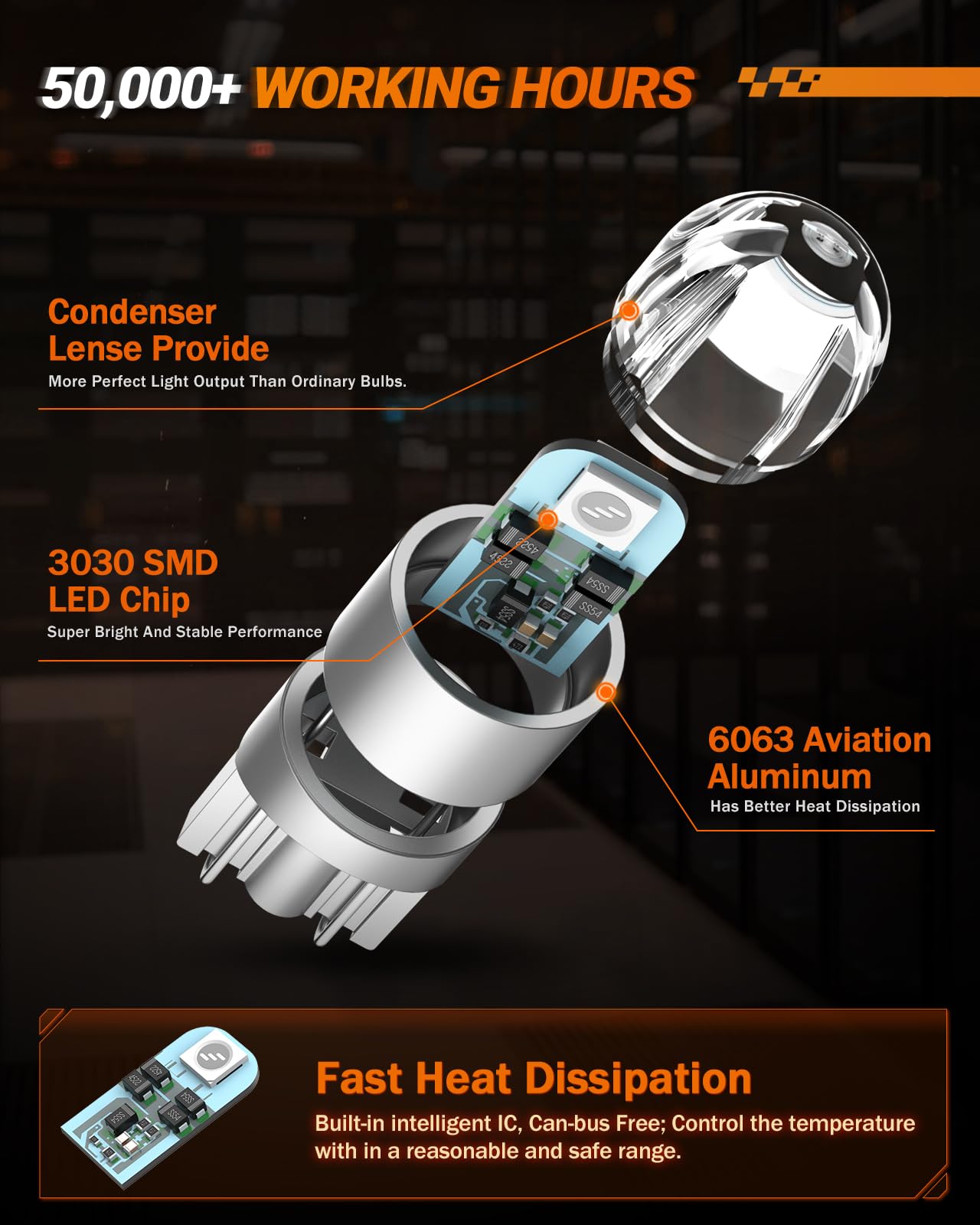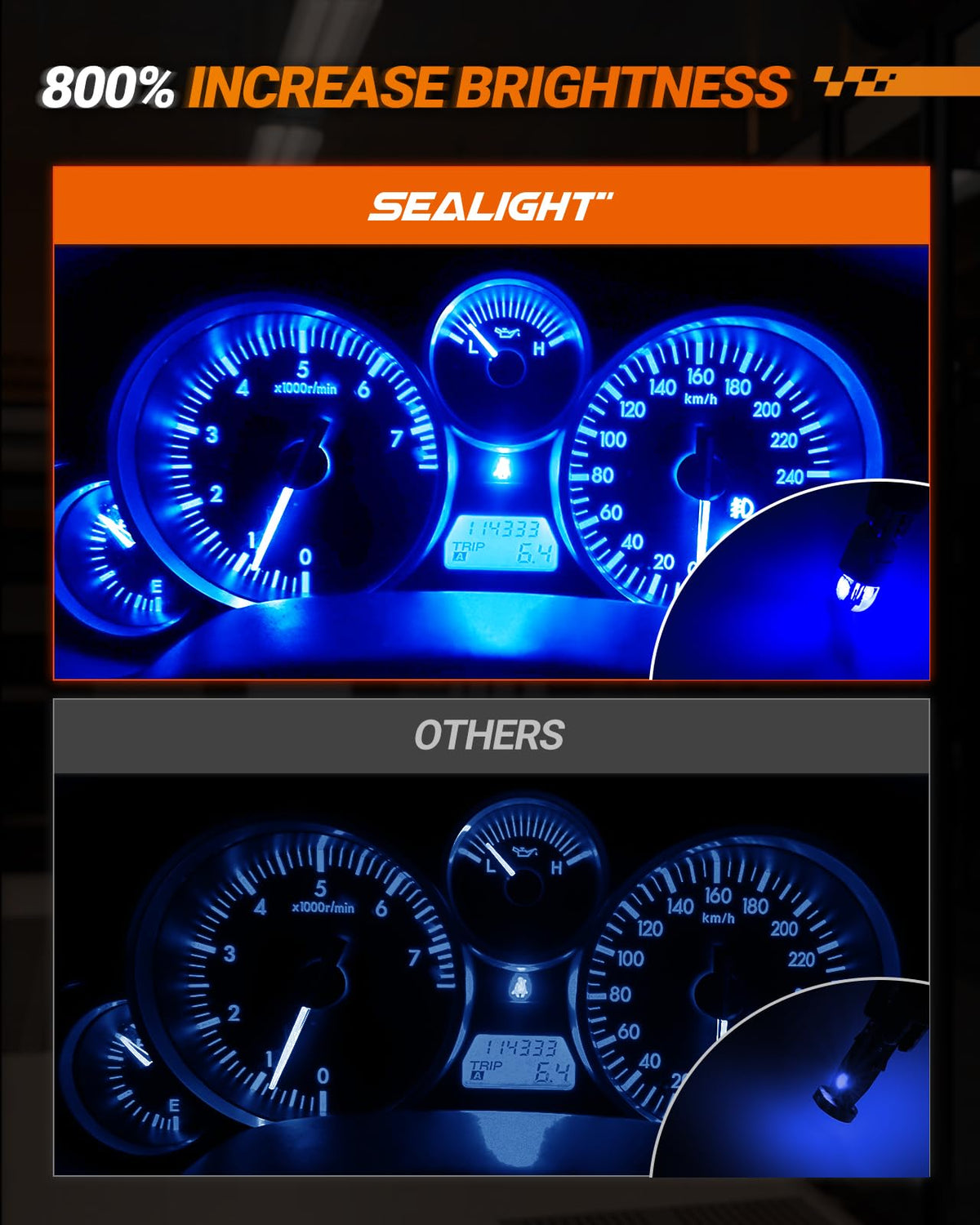 Q: How bright is the SEALIGHT 194 LED Bulb compared to halogen bulbs?A: The SEALIGHT 194 LED Bulb is 800% brighter than traditional halogen bulbs, thanks to its advanced 3030 high-performance light chip, providing super bright blue illumination with a 360° lighting angle, ensuring no dark spots.