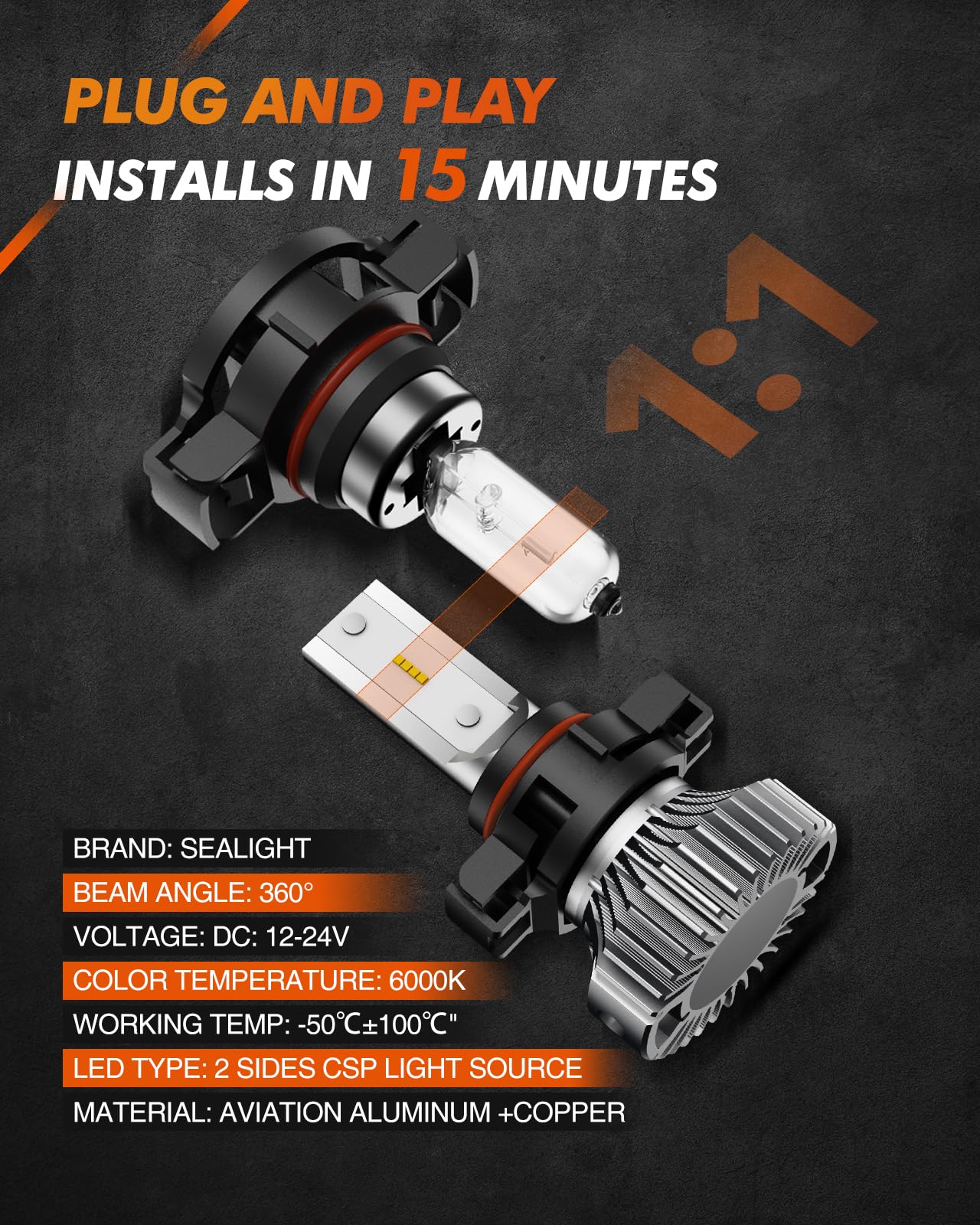 Q: How do I install the SEALIGHT 5202 LED Fog Light Bulbs?A: Installation is straightforward: simply remove the old bulb from the fog light housing, insert the SEALIGHT 5202 LED bulb, and secure it in place. No additional tools are required, and the process can typically be completed within minutes.