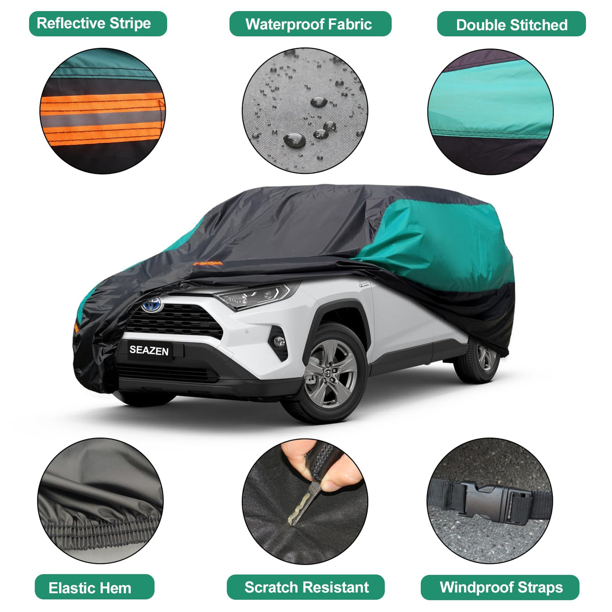 ?Durable Material? SEAZEN full exterior cover made of 210T fabric and stitched with double needle and double thread, which is more sturdy, wear-resistant and tear resistant. The surface of the fabric has a waterproof coating design, make the car cover have better water resistance, can withstand 1500P water pressure, great for rainproof snowproofing, coating is also good at sunproof and anti-UV, keeps car cool in hot day, suitable for all season. | ?Quick Cleaning and All Weather Protection?Wipe down the car cover with a damp cloth and the mess will slide right off. Get rid of the dirt, gunk, and grime in no time! SEAZEN car covers protect your car four seasons from Hot Summer Sunshine, Leaves, Dirt, Dust, Scratches, Snow, Rain, Industrial Pollutants and Bird Droppings. | ?Car Cover Feature?1) Multi-Layer Fabric, Strong and Durable. 2) 3 Windproof Straps and Buckles Design at Front , Middle and Rear prevent the car cover from being blown away by the heavy wind . 3) 4 Reflective Stripes Warn People in the Night. 4) Super Waterproof Performance. 5)Pocket Storage Bag is Included. | ?Applicable Models? Fit Suv truck-Length Up to 200', SEAZEN car cover suitable for Nissan Pathfinder/Murano, Ford Explorer/Edge, Toyota Highlander, Jeep Grand Cherokee, Chevrolet Trailblazer, Nissan Murano, AUDI Q7, ACURA ZDX,BMW X5/X6, HONDA Pilot, Hyundai Veracruz/Santa Fe 7seats, Land rover Discovery4/Sport/Range Rover (L405), LADA Sequoia, LEXUS GX/LX, Mecreds-Benz GLS class, Mitsubishi Pajero, TOYOTA Land Cruiser/Prado, Volkswagen Touareg etc. | ?Warm Tips & Service?Please check the car size and details before your purchase. After receiving the car cover, please contact us in time if there is any problem, we will deal with the after-sale problems for you immediately. We stand behind our products and service and always try to give you the best satisfaction.