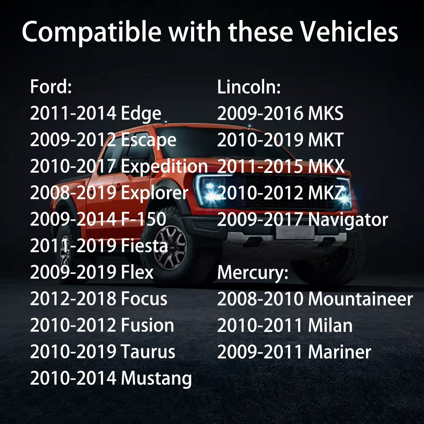 Compatible with these Vehicles: Compatible with Ford: Compatible with 2011-2014 Edge Compatible with 2009-2012 Escape Compatible with 2010-2017 Expedition Compatible with 2008-2019 Explorer Compatible with 2009-2014 F-150 Compatible with 2011-2019 Fiesta Compatible with 2009-2019 Flex Compatible with 2012-2018 Focus Compatible with 2010-2012 Fusion Compatible with 2010-2019 Taurus Compatible with 2010-2014 Mustang Compatible with Lincoln: Compatible with 2009-2016 MKS Compatible with 2010-2019 MKT Compatible with 2011-2015 MKX Compatible with 2010-2012 MKZ Compatible with 2009-2017 Navigator Compatible with Mercury: Compatible with 2008-2010 Mountaineer Compatible with 2010-2011 Milan Compatible with 2009-2011 Mariner