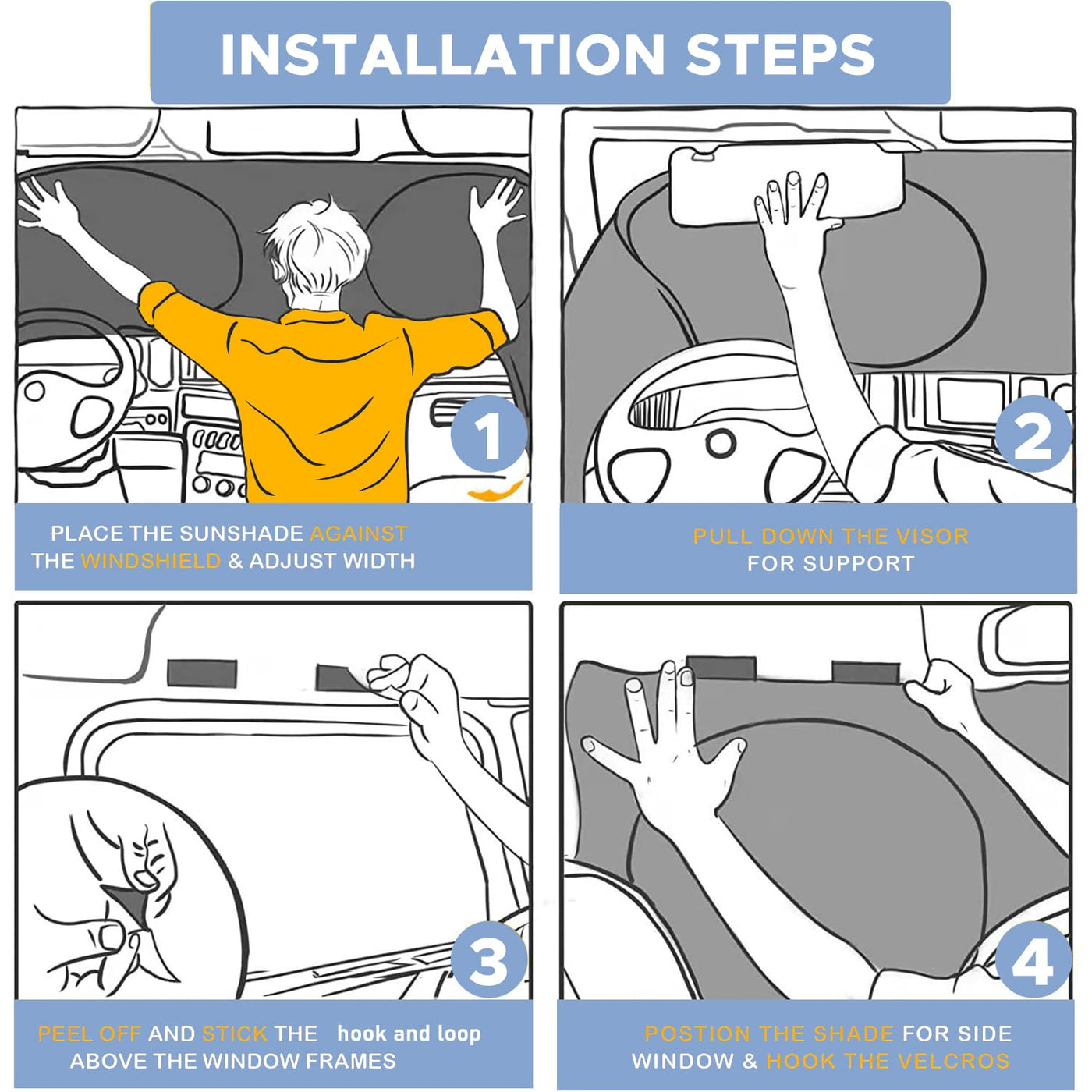 Q: How does the sunshade protect against heat and cold?A: Constructed from high-quality 300T nylon polyester, this sunshade effectively reflects and blocks 99% of harmful ultraviolet rays, reducing the interior temperature in summer. It also helps retain warmth during winter, ensuring a comfortable cabin environment year-round.