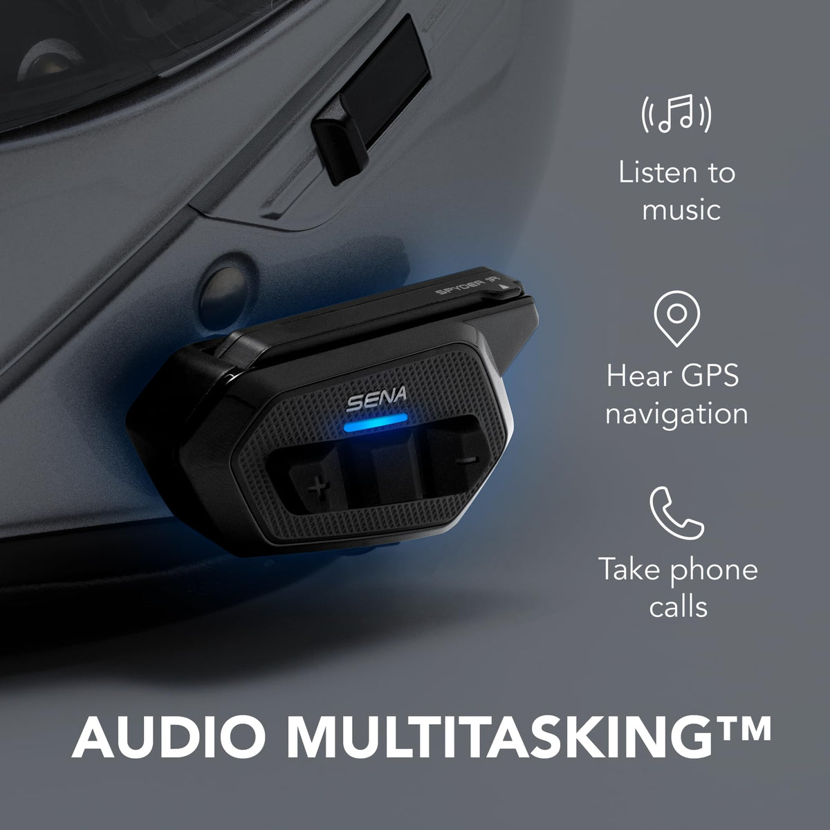 Q: What are the key features of the Sena Spider RT1's audio system?A: The Sena Spider RT1 is equipped with upgraded HD speakers that are optimized for audio quality, providing a boost in volume, bass, and clarity for a superior listening experience.