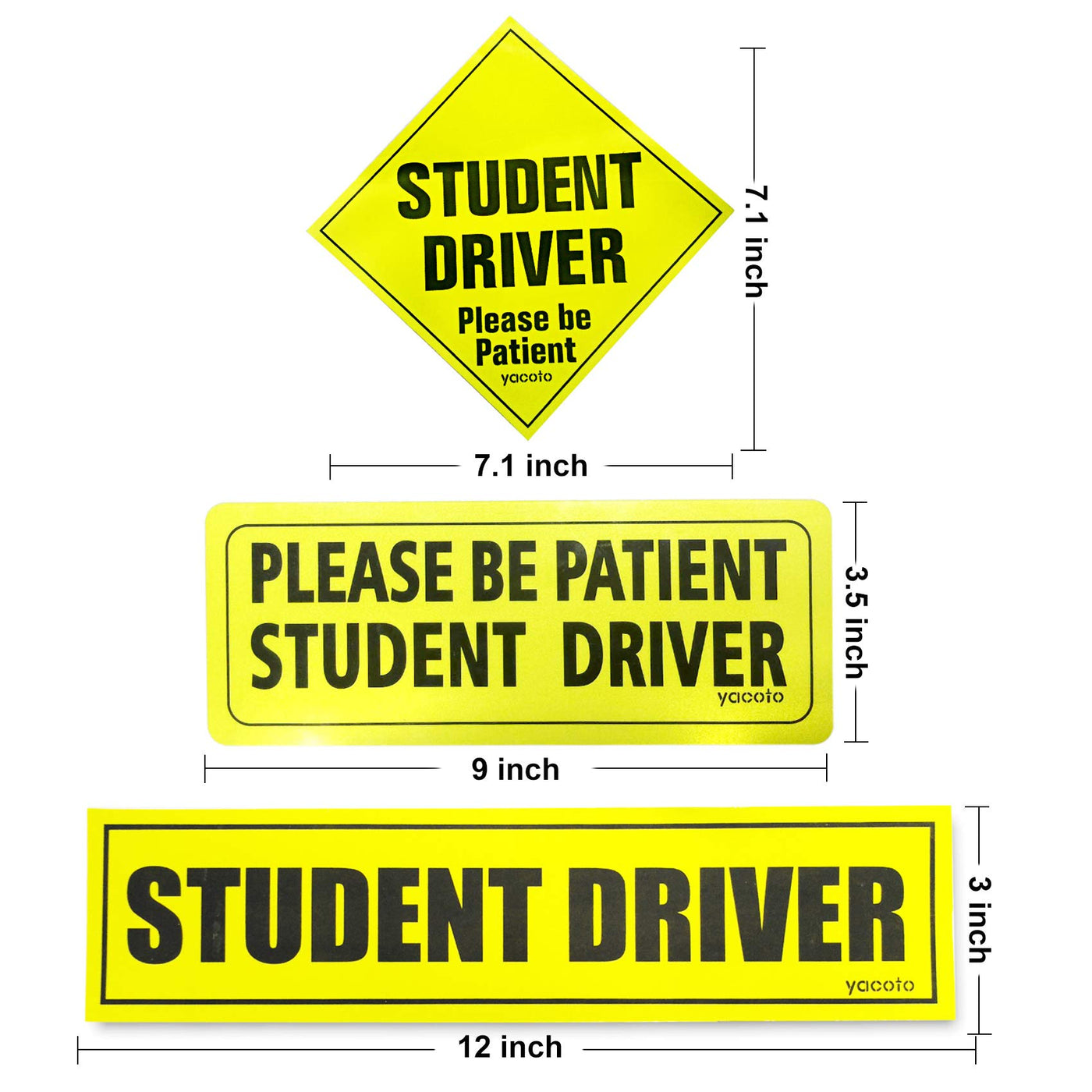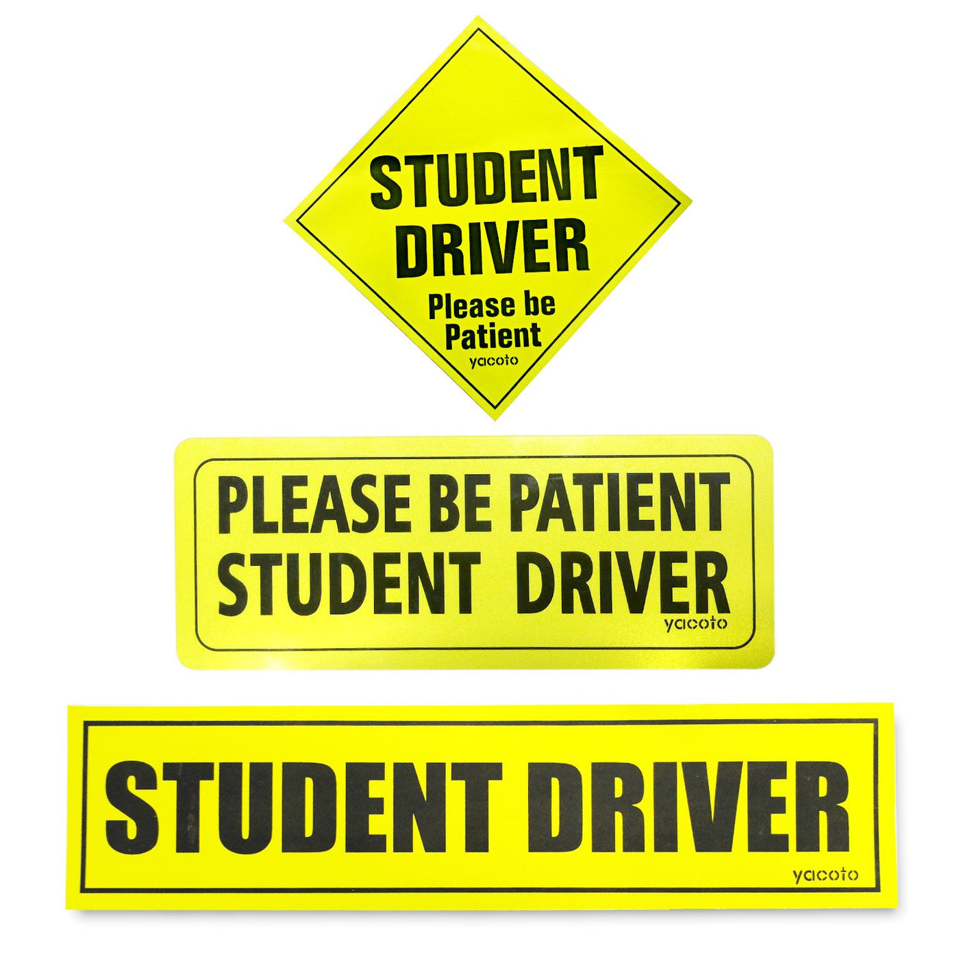 Set Of 3 Student Driver Magnet - Reflective Student Driver Sign For Car Student Driver Car Magnet Safety Vehicle Bumper Sticker For New Drivers About The Product - The Reflective Student Driver Decal Is Crafted With Black Lettering That Perfectly Combined With A Vibrant Yellow Background Color Which Is So Readable Even A Distance. - By Being Noticeable To The Nearby Drivers Will Prevent Accident For They Will Give You Patience, Respect And Enough Space To Practice. - This High Quality Student Driver Car Magnet Is Tested To Last Well Pass The New Driver Stage. It Can Easily Be Switched From Vehicle To Vehicle Or To Another Metal Surface As It Is Removable And Reusable. - Comes With 3 Pack Student Driver Stickers, Perfect For Each Side And The Rear. Reflective For Added Safety In Low Light Or Night Time Driving Conditions. - Student Driver Sign Is A Great Way To Protect Your New Driver By Alerting Other Drivers To Use Caution When In Close Proximity To Your Vehicle. - No Need To Worry About Driving Not Skilled, Just Go On Your Way. Include 3 X Reflective Student Driver Sign, 5''X5'',9''X3.5'',12''X3'' About Yacoto Professional Team Does Professional Things. If You Are Not Completely Satisfied With Your Purchase, We Will Do Whatever It Takes To Make Sure You Are Happy! Our Goal Is Your Satisfaction! Get One For Yourself And One For Your Best Friend Or Someone You Love! Click The ''Add To Cart'' Button And Order Now!