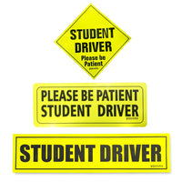 Q: What are the dimensions of the student driver magnets?A: The set includes three reflective student driver magnets with dimensions: 5''x5'', 9''x3.5'', and 12''x3''.