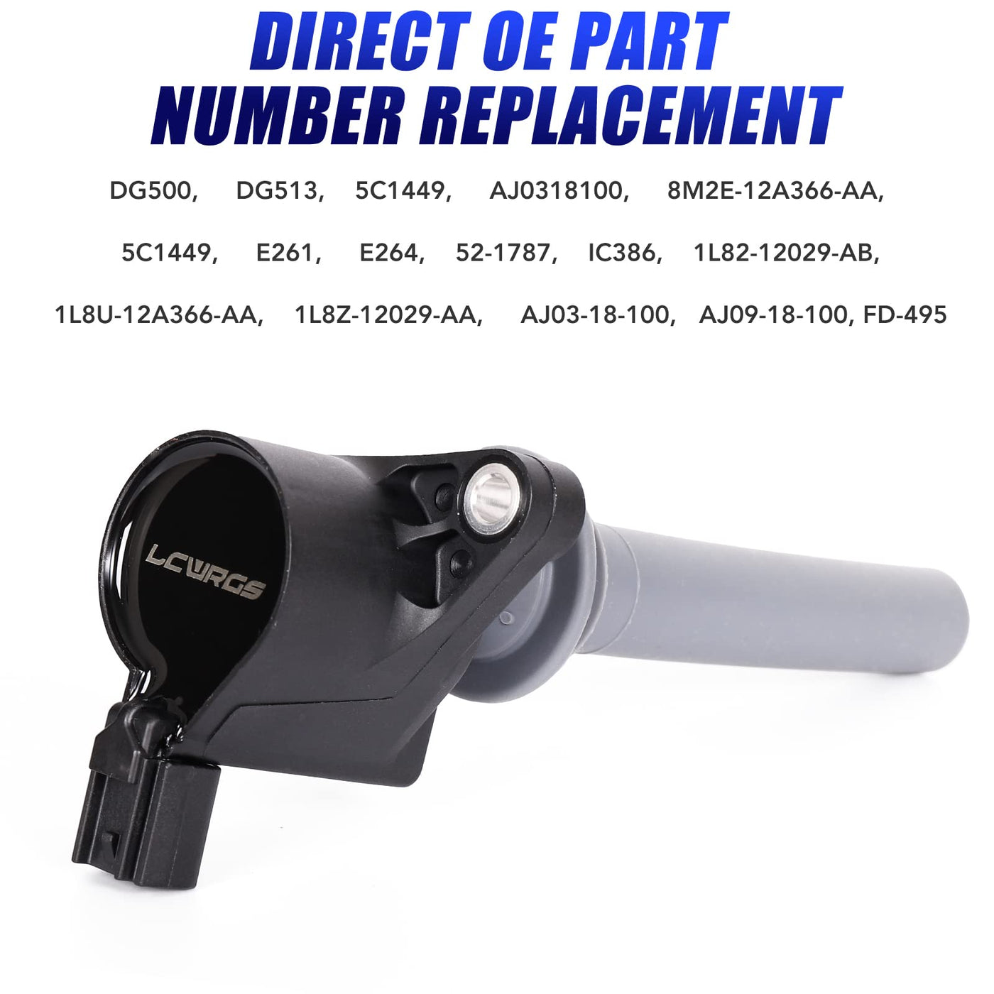 Q: What are the replacement part numbers for the ignition coils and spark plugs?A: The replacement part numbers for the ignition coils include DG500, DG513, and 5C1449, while the spark plug part numbers are SP493, AGSF32PM, and 3L1E12405AA. It’s essential to verify these part numbers with your vehicle's specifications to ensure proper fit.