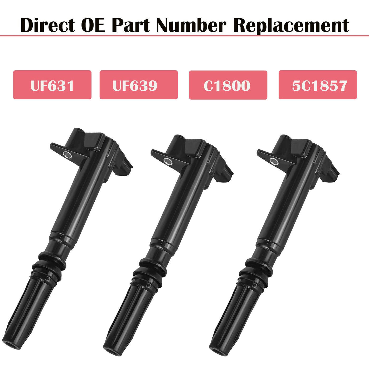 Q: What are the OEM part numbers that these ignition coils replace?A: These ignition coil packs replace several OEM part numbers, including UF631, UF639, C1800, C1801, 5C1857, 5C1858, and DG525. Always check to ensure compatibility with your specific vehicle model.