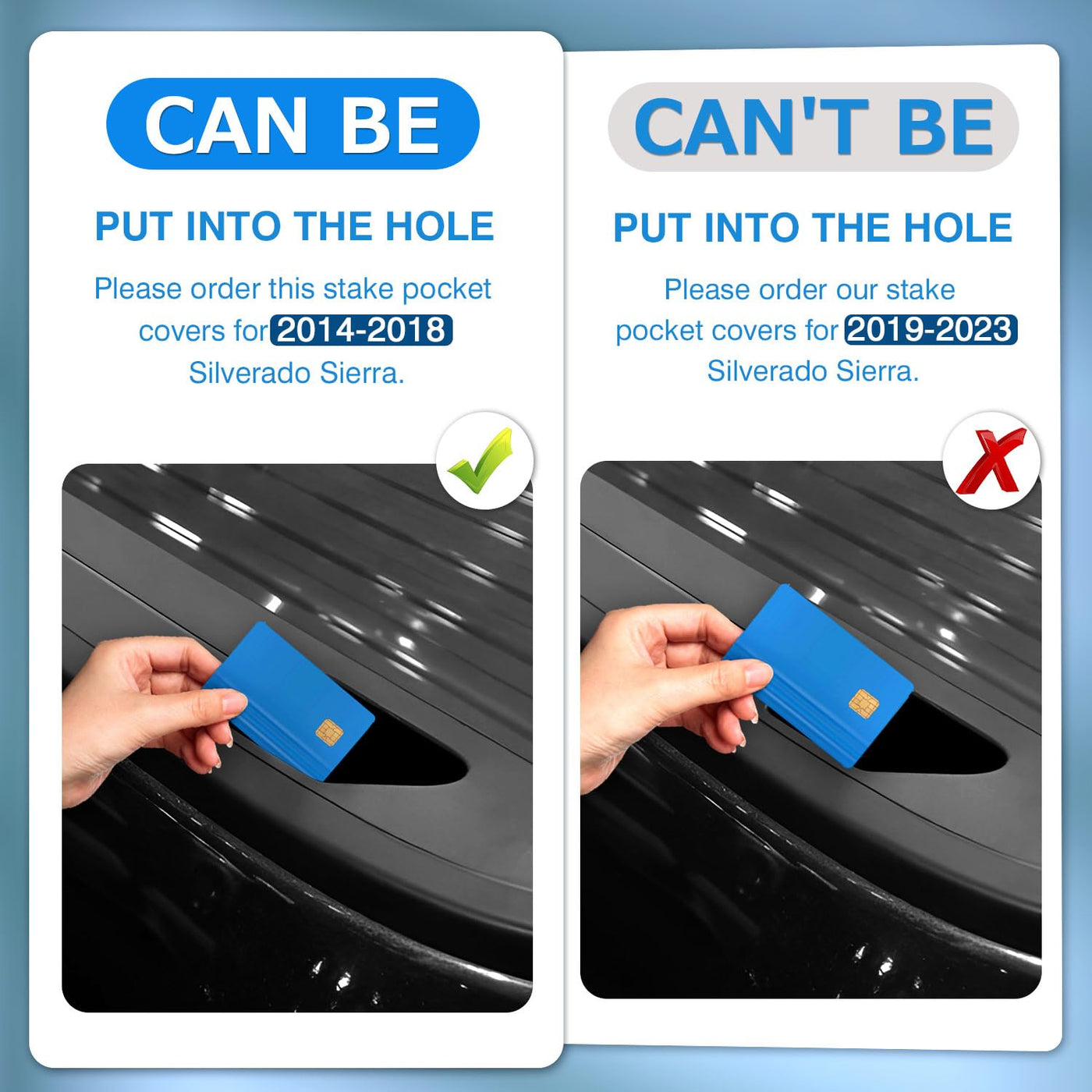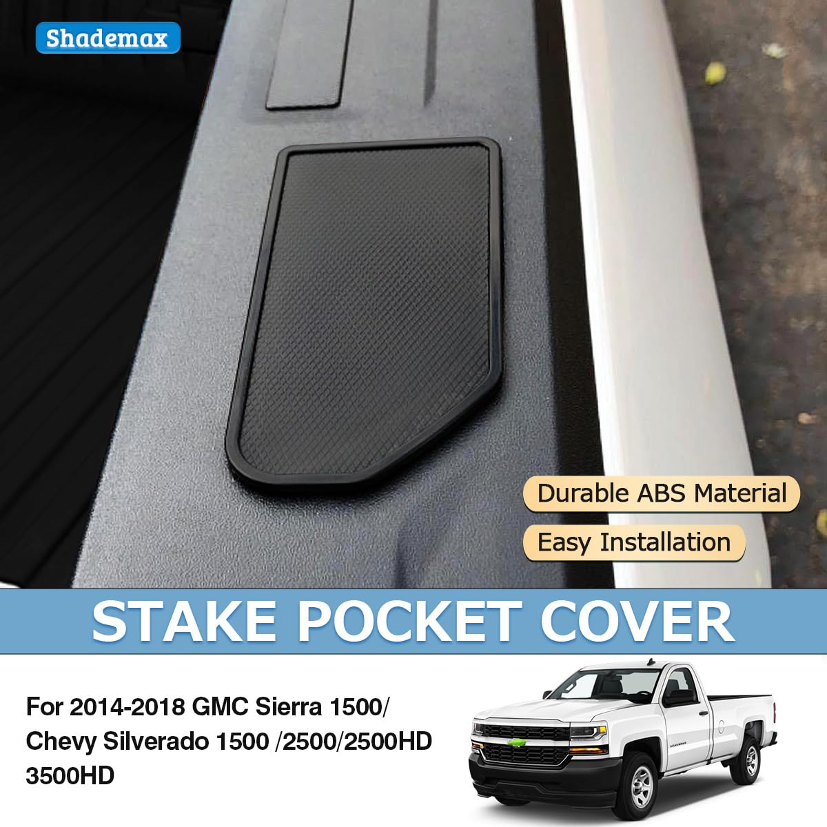 Shademax Bed Rail Stake Pocket Cover Fit for 2014-2018 GMC Sierra /Chevrolet Silverado Fit for 2014-2018 GMC Sierra 1500 Denali/SLE/SLT/AT4/Base/Elevation, 2014-2018 Chevy Silverado 1500/2500/2500HD/3500HD High Country/LT/LTZ/Work Truck. These stake pocket plugs Not Fit High Desert Package, Colorado/Canyon, Updated 2019+ Silverado/Sierra, or trucks with dual rear wheel. Careful Detail Perftct Fitment Durable & High-quality Easy Installation With soft lint, make installation become more easier. Please make sure the stake pocket holes are dry and clan bedore installation.