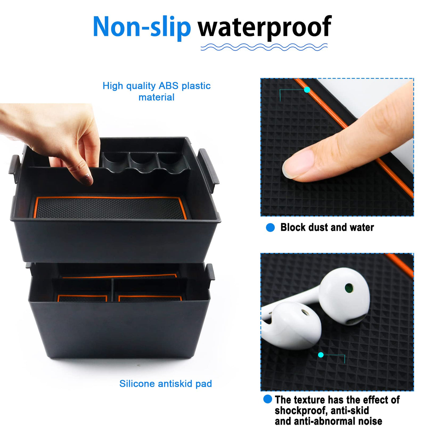 Q: What materials are used in the construction of this organizer?A: The center console organizer is made from premium ABS plastic, which is durable and easy to clean. It also features non-slip rubber mats to prevent items from sliding around.