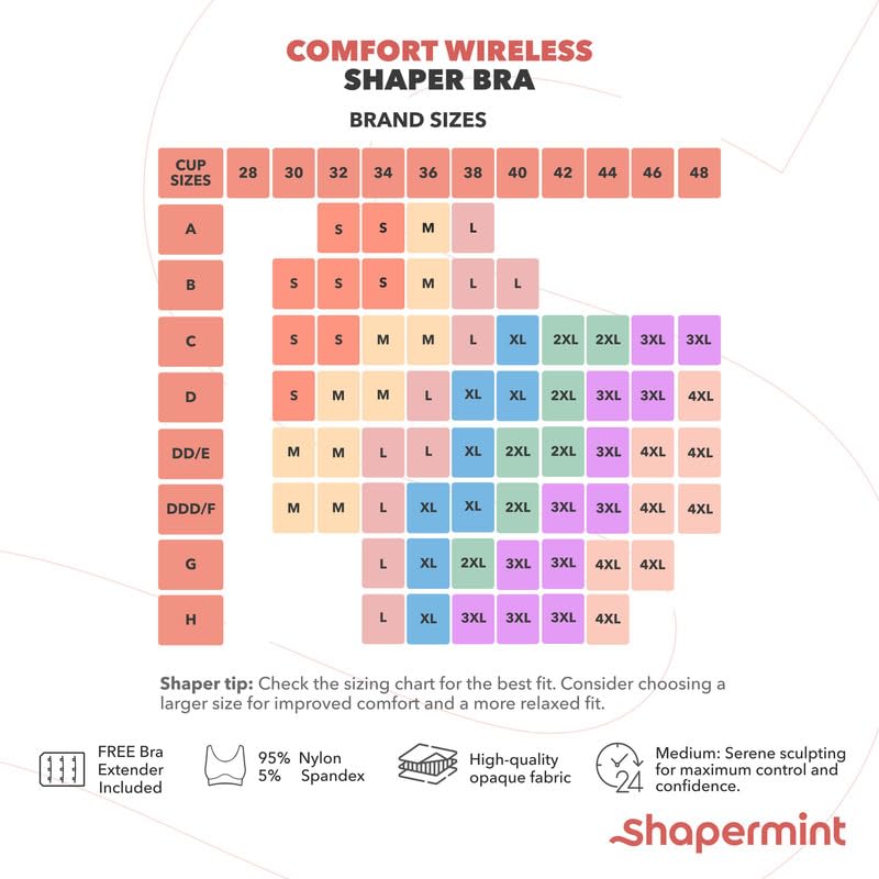 Q: What sizes do SHAPERMINT bras for women come in?A: SHAPERMINT bras are available in a wide range of sizes, from Small to Plus Size. Specifically, you can find sizes such as 34DDD/E, 36DD/E-DDD/F, 38C-D, and 40B-C. Be sure to check the sizing chart for the best fit.