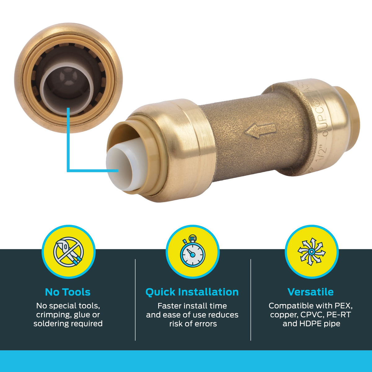 Product DescriptionSimplify your plumbing projects with the SharkBite brass push-to-connect check valves. Composed of DZR forged brass, this plumbing valve is corrosion free and is perfect for preventing the reverse flow of water quickly and easily. This brass plumbing fitting features a push-to-connect design which is ideal for working in tight spaces and can be installed either horizontally or vertically. These push-to-connect valves are easy to install, compatible with PEX, PE-RT, CPVC, SDR-9 HDPE, and copper pipe fixtures, and do not require any special tools, glue, crimping, or soldering for installation. These spring-loaded check valves are suitable for commercial repairs or home improvement projects. SharkBite brass check valves can withstand 200 degrees F and 150 PSI. 25-year warranty.From the ManufacturerSharkBite U2008-0000LFA Check Valve General Purpose 1/2-Inch Spring Loaded