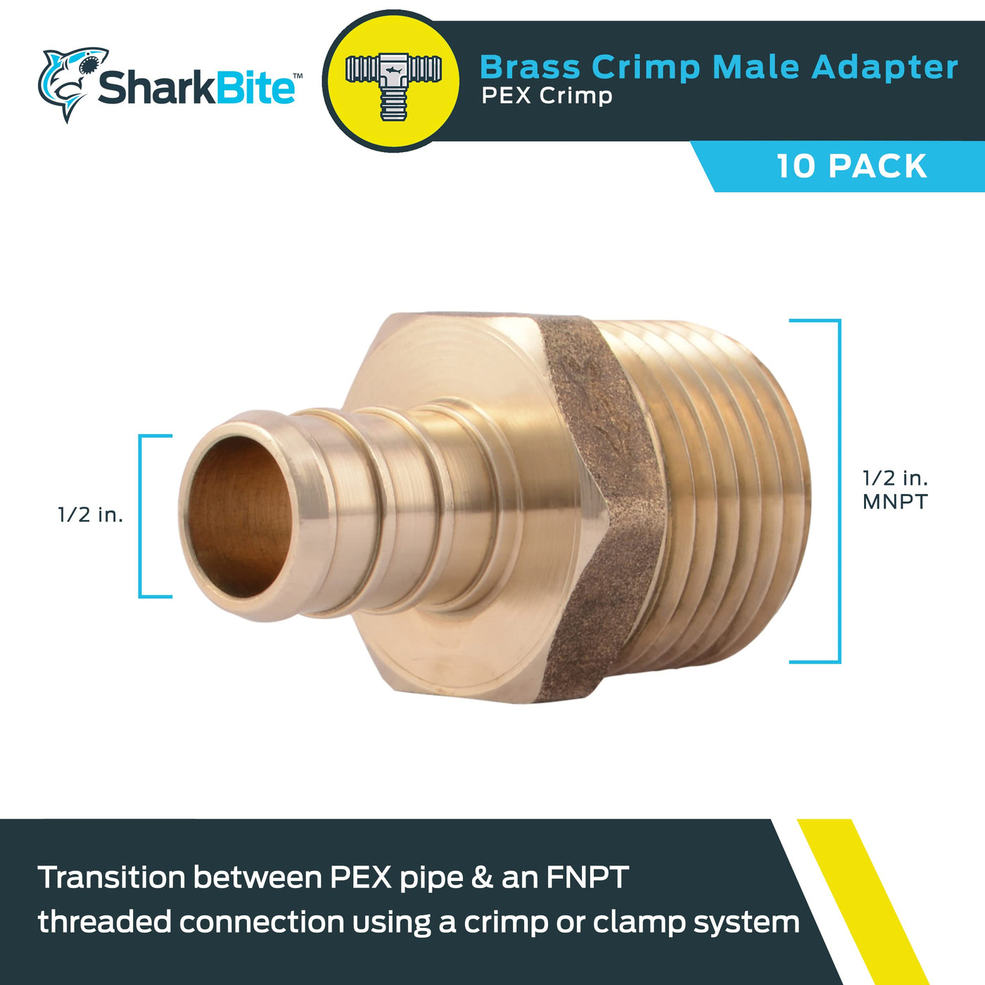 SharkBite 1/2 Inch Crimp MNPT Male Adapter, Pack of 10, Brass Plumbing Fitting, PEX Pipe, Copper, UC120LFA10