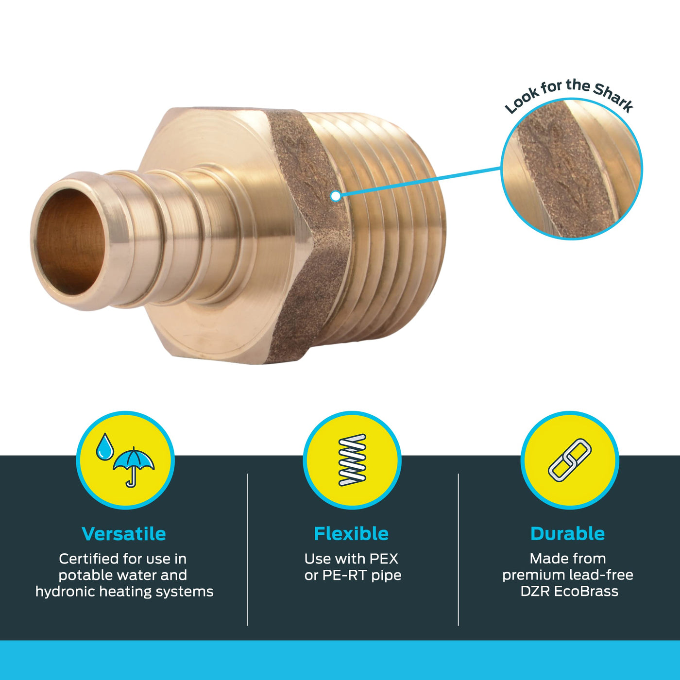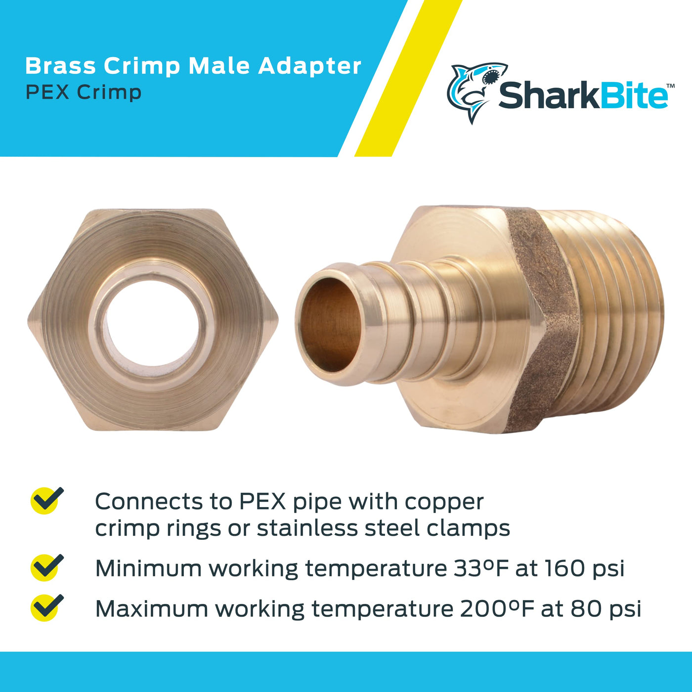 Simplify your plumbing projects with the SharkBite brass crimp male connector. Made from lead-free DZR brass, this brass crimp male adapter is corrosion free and is perfect for making a transition between a PEX pipe and female NPT threaded connection using copper crimp rings or stainless steel clamps. These crimp male couplers are compatible with PEX and PE-RT pipes. SharkBite brass fittings feature a minimum working temperature of 33 degrees F at 160 PSI and a maximum working temperature of 200 degrees F at 80 PSI. These crimp male connectors are certified for use in potable water and hydronic heating system applications.