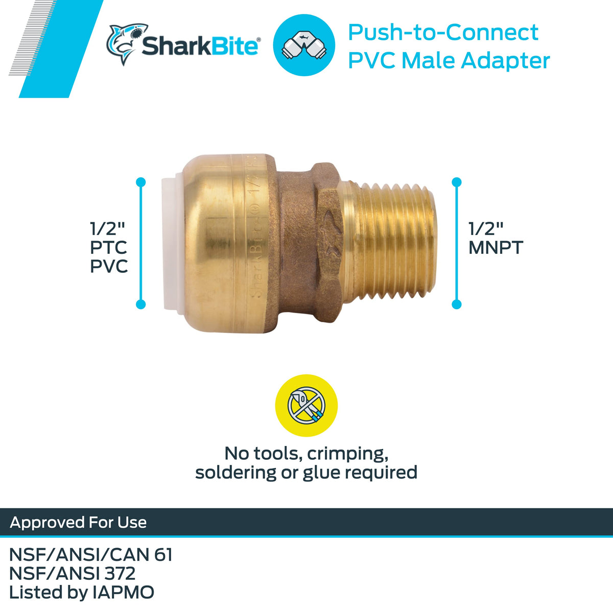 SharkBite 1/2 Inch PVC x 1/2 Inch MNPT Adapter, Push to Connect Brass Plumbing Fitting, PEX Pipe, Copper, CPVC, PE-RT, HDPE, UIP120A