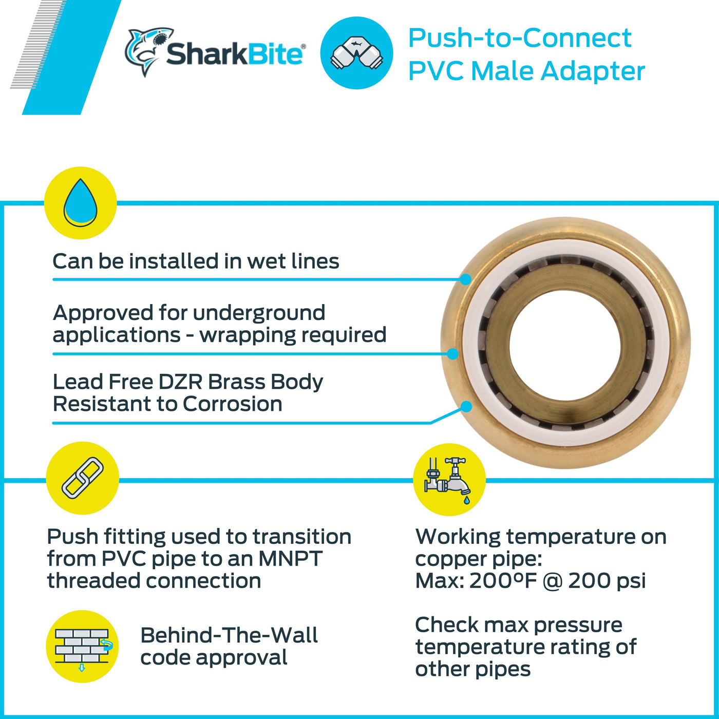 Simplify your plumbing projects with the SharkBite MNPT brass male adapter. Composed of strong and sturdy brass metal, this male PEX fitting is perfect for making a transition from PVC or IPS (iron pipe size) pipe to PEX, copper, CPVC, PE-RT, or HDPE pipe without the need for glue, soldering, or additional tools. Compatible with schedule 40, 80 and 120 PVC pipe, these SharkBite plumbing fittings are approved for underground and behind-the-wall applications with no access panels (wrapping required when burying underground), and can be installed in wet lines. Brass male fitting is rated to 200 psi and 200 degrees F (93 degrees C).