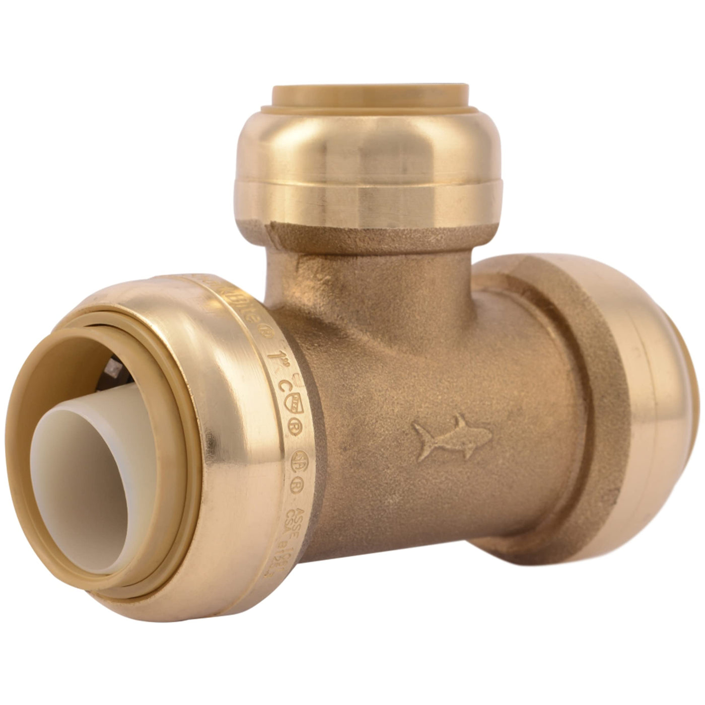 Product DescriptionSharkBite 1 Inch x 1 Inch x 3/4 Inch Reducing Tee, Push to Connect Brass Plumbing Fitting, PEX Pipe, Copper, CPVC, PE-RT, HDPE, U416LFAFrom the ManufacturerSharkBite is the push-fit connection system that's really taking hold. It's the easiest way to join copper, CPVC or PEX pipe in any combination - with no soldering, clamps, unions or glue. Just insert the pipe and the stainless steel teeth bite down and grip tight, while a specially formulated O-ring compresses to create a perfect seal. Disassembly is just as fast using the simple disconnect tool. So fittings and valves can be easily changed and reused. They can even be rotated after assembly for easier installation in tight spaces. Get SharkBite, and get a grip on your next plumbing project. These fittings are lead free and meet all requirements for plumbing in California and Vermont.