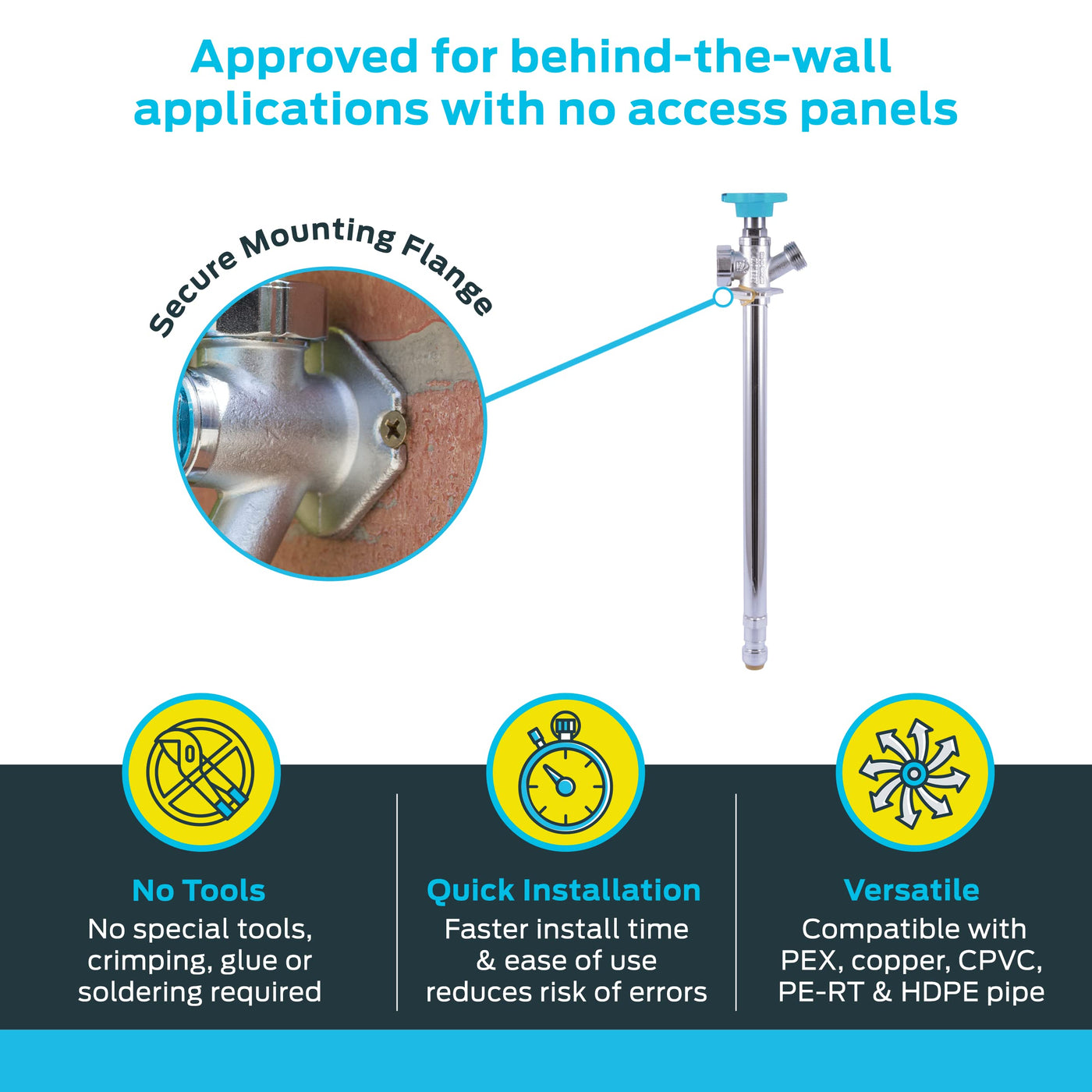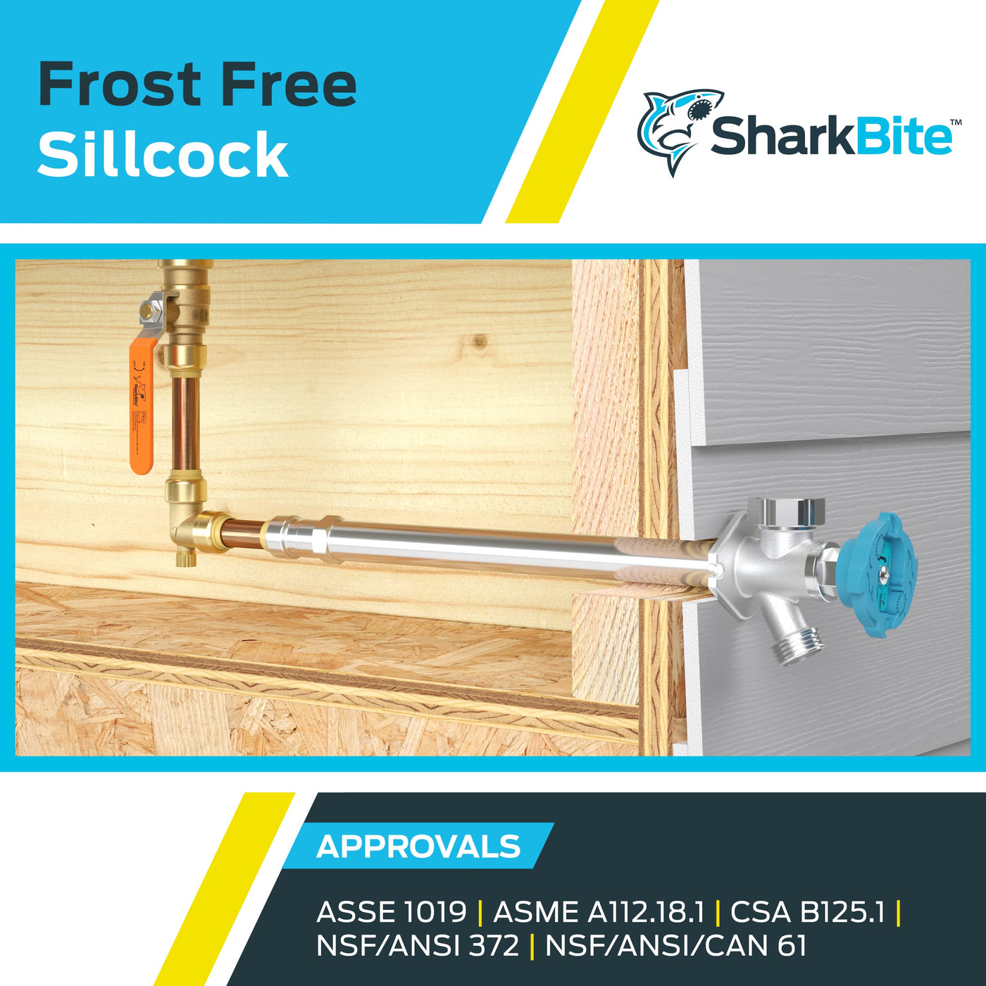 Simplify your plumbing projects with the SharkBite brass push-to-connect frost-free sillcock. Ideal for working in tight spaces, the frost-free sillcock features an integrated vacuum breaker to prevent backflow and a mounting flange to secure the valve. The outside faucet valve of this sillcock features an integrated 1/2 inch push-fit inlet and 3/4 inch garden hose outlet, and a shut-off can be found at the inlet of the sillcock to drain the water and provide protection for the valve when freezing. These brass sillcocks work well with PEX, CPVC, PE-RT, SDR-9 HDPE, and copper pipes. The SharkBite brass frost-free sillcock features a push-to-connect mechanism for a watertight union, and allows for quick and easy installation, with no tools, crimping, glue, or soldering required, and can be installed in wet lines. Approved for behind-the-wall applications with no access panels, these plumbing sillcocks are suitable for freeze, emergency repairs, and home improvement projects. All SharkBite valves, clips, joints, and adapters are manufactured and tested in the USA.
