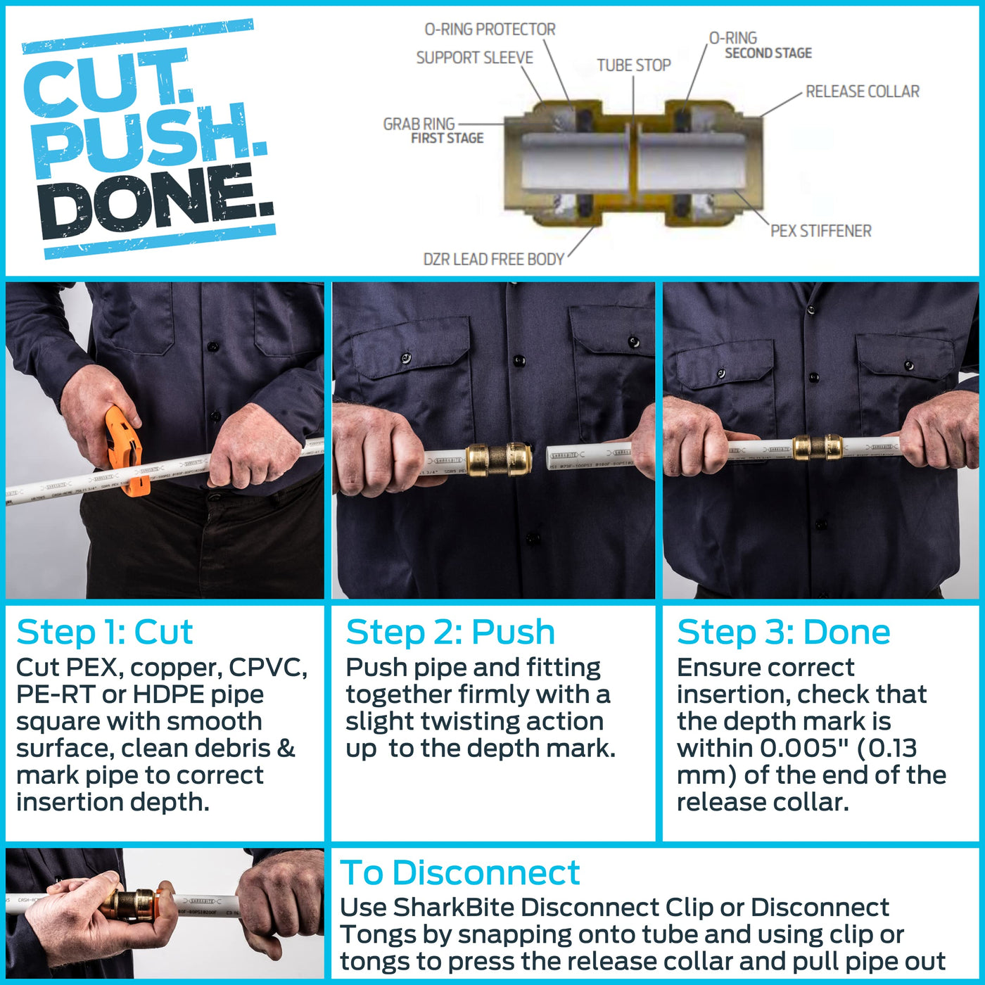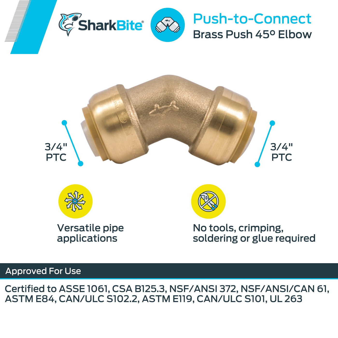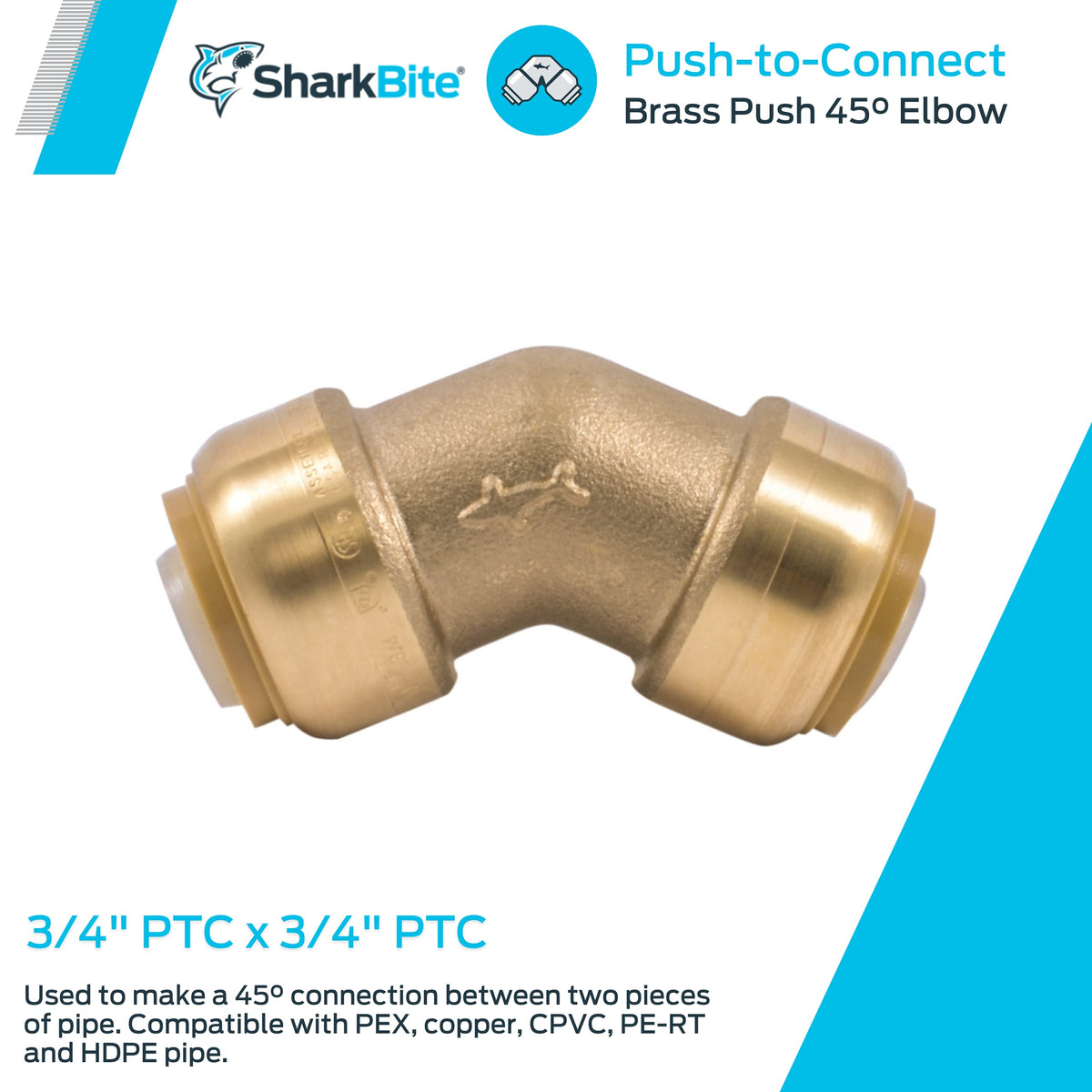 With SharkBite 45-Degree Elbows, you can connect two pieces of PEX, copper, CPVC, PE-RT, and HDPE pipe in any combination. With no soldering, clamps, or glue required, connections are as simple as inserting a pipe into the fitting deep enough to be sealed by the specially designed O-ring. Once inserted, the fitting's stainless steel teeth bite down and grip the pipe. Disassembly is just as easy with a Shark Bite disconnect tool. Shark Bite 45 Degree Angle Elbows can be installed in wet lines and are approved for underground and behind-the-wall applications with no access panels (wrapping is required when burying underground). This plumbing fitting is rated for 200 PSI and 200 degrees Fahrenheit. SharkBite products feature a 25 year warranty