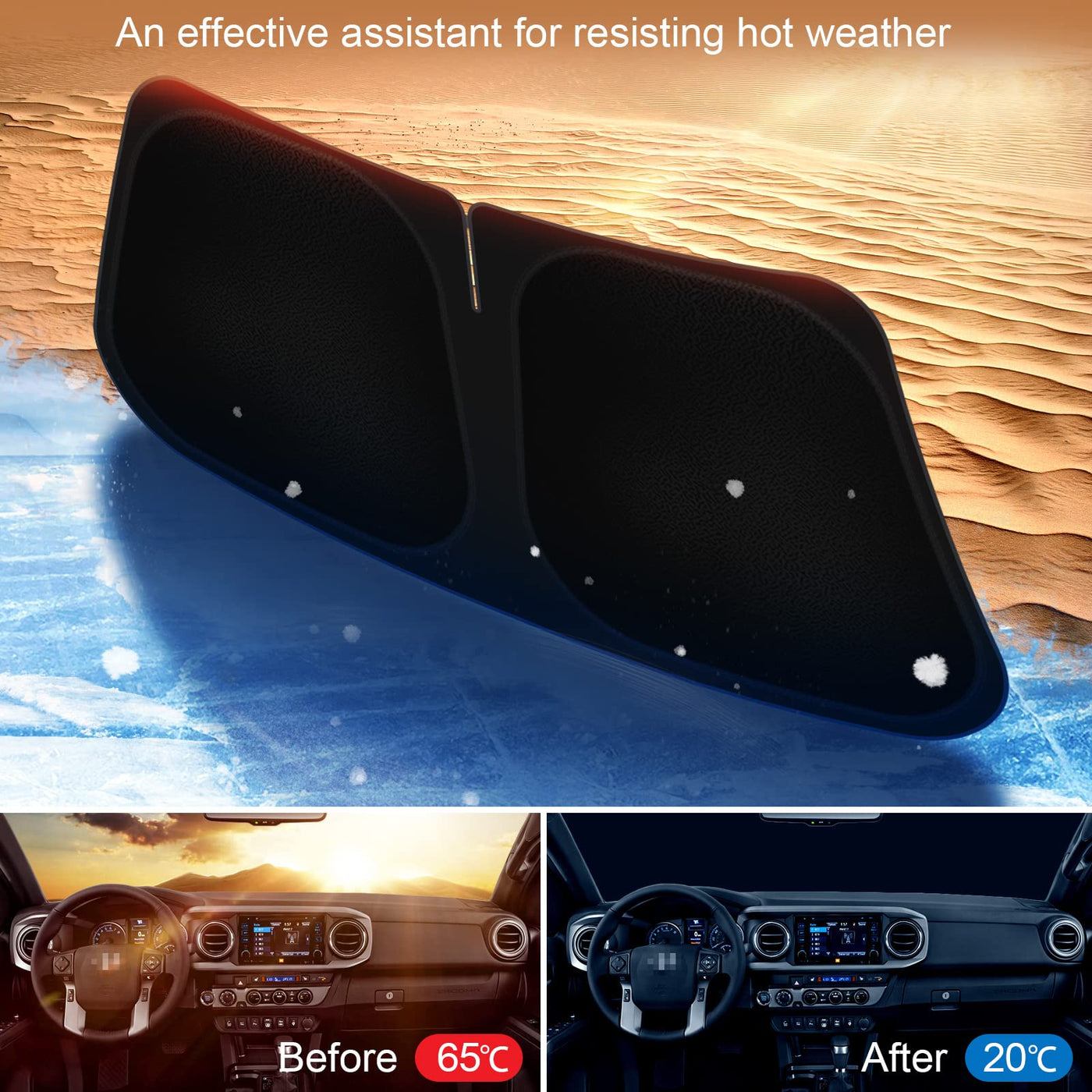 The windshield sunshade for toyota tacoma are made of high-quality 240T polyester material, the silver layer in the car sun shade reflects sunlight, and the black layer reduces the hot temperature inside the cabin. The car windshield sun shade protects the car interior accessories and prevents the leather seats from cracking and fading. Protect your car during the hot summer!