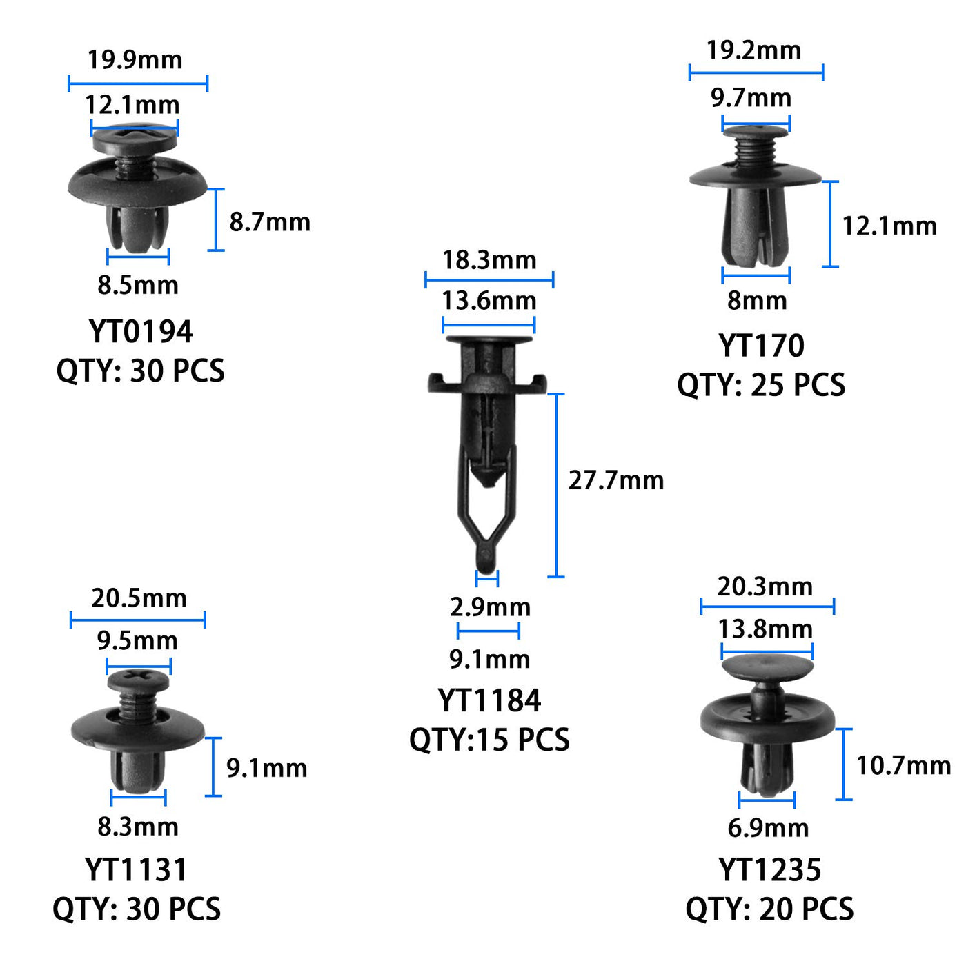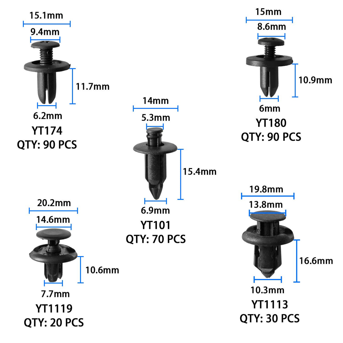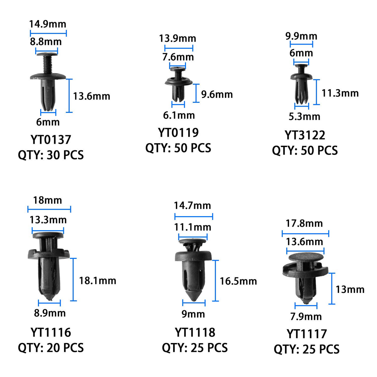620Pcs CAR RETAINER PUSH CLIPS KIT: 16 kinds of common size Suitable for for the trim panel clips, door trim clips, door panel clips,bumper clips,Fender clips,engine cover and splash shield retainers replacement. | UNIVERSAL FIT FOR MOST OF THE CAR: Great for GM, Ford, Chrysler, Toyota, Honda, Nissan, Mazda, Chevy, etc.for the cars that the size and shape fit your requirements. | HIGH QUALITY: Most of our car retainer push clips kit are made of high quality nylon. Rugged, shock resistant, resistant to cracking or cracking. | ADDITIONAL BONUS: The Plastic Fastener Remover For easy removal of door panel clips without causing damage | NOTE: Please check the size of the prouducts pictures,type and shape to make sure the item is the one that you need.If You Have Any Problems ,Take Time To Contact With Us,We Are In 24 Hours Service !
