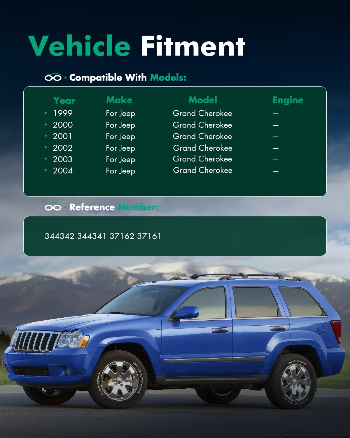 PART NUMBER.COMPATIBLE VEHICLES: Front Rear Driver and Passenger Side Shock Absorber Set: 344342 / 37162 / 344341 / 37161 with 1999 2000 2001 2002 2003 2004 for Jeep Grand Cherokee | FULL SET (4pcs): 2pcs Front (Left + Right) and 2pcs Rear (Left + Right) Shock Absorbers Shocks and Struts for Jeep. TIPS!!! Shock absorbers ONLY, not including springs,washers, bushings and mounts | SCITOO HIGH PERFORMANCE SHOCK ABSORBERS: Hard chromed piston rod, microcracks chromed surface processes and ultra-precision vertical polishing | FEATURE FOR SCITOO BARE STRUT SHOCKS: 1.Reduce vehicle bounce, roll and sway, brake dive and acceleration squat. 2.Buckle holes are consistent with the car in situ, without any changes, easy and quick installation. 3.Mono tube design dissipates heat rapidly, increasing durability and product life span. 4.Improved control and stability, precise handling, ultimate performance, and incredible comfort. 5.Quieter, smoother driving than worn or damaged struts | PURCHASING NOTICE: Please use Amazons vehicle fitment tool (located at the top of the listing on desktop, below the images on mobile) Cheack the VIN or year/make/model/trim/engine of your car