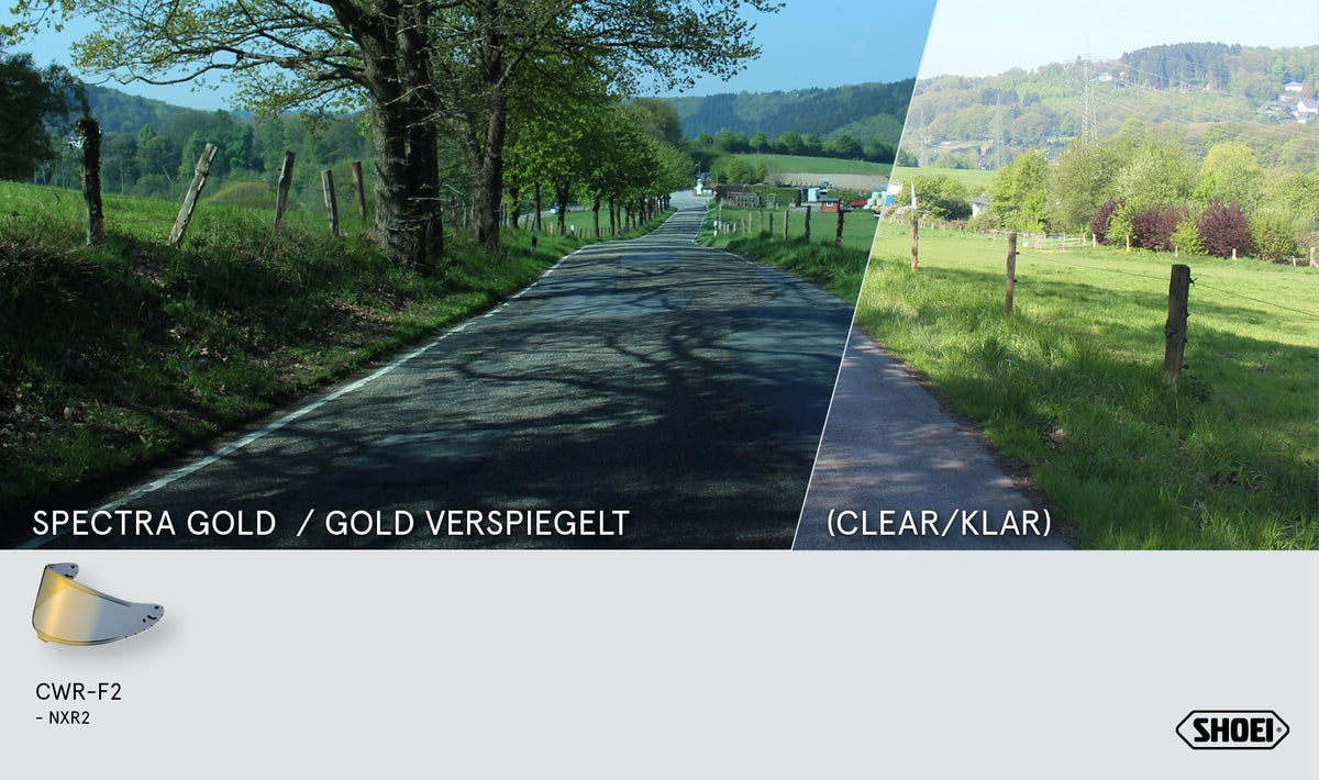 Shoei - Cwr-F2Pn Visor For Nxr 2. The Visor Cwr-F2Pn Is Suitable For The Brand New Nxr 2 Helmet From Shoei. With Ideal Glare Protection, It Is Perfect For Sunny Days. Details: Pinlock Preparation: Yes, Light Transmission: Clear: Min 85% Photochromic: Dynamic 23-80% Light Tinted: 56-62% Strong Tinted: 24-30% Silver Mirrored: 24-30% Blue Mirrored: 24-30% Gold Mirrored: 24-30% Rainbow Mirrored: 24-30% -30% Yellow Tinted: 85% Uv Filter: >99% Use: Clear: Day/Night Photochromic: Day (Sunny To Changeable). Lightly Tinted: Day (Sunny To Changeable). Strong Tinted: Day (Sunny). Silver Mirrored: Day (Sunny). Blue Mirrored: Day (Sunny). Gold Mirrored: Day (Sunny). Rainbow Mirrored: Day (Sunny). Yellow Tinted: Day (Sunny). Cloudy Weather)