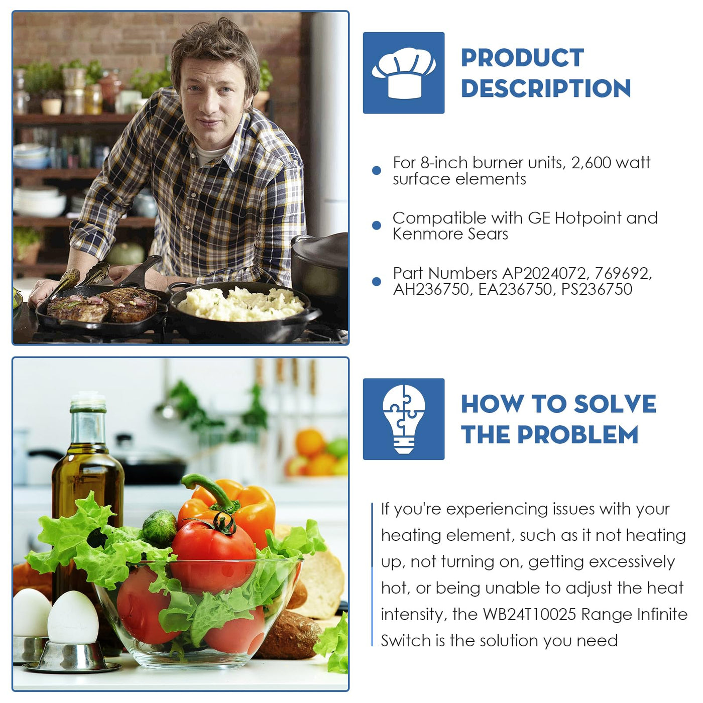 Q: What is the compatibility of the WB24T10025 Range Infinite Control Switch?A: The WB24T10025 Range Infinite Control Switch is compatible with various GE electric range models, specifically designed for 8-inch burner units. It replaces part numbers AP2024072, 769692, AH236750, EA236750, and PS236750, making it suitable for a wide range of GE Hotpoint and Kenmore Sears electric ranges.