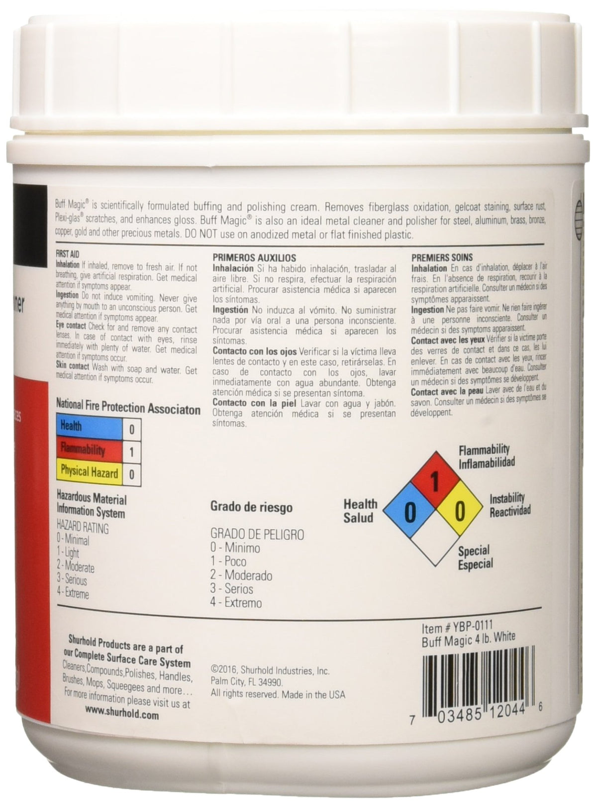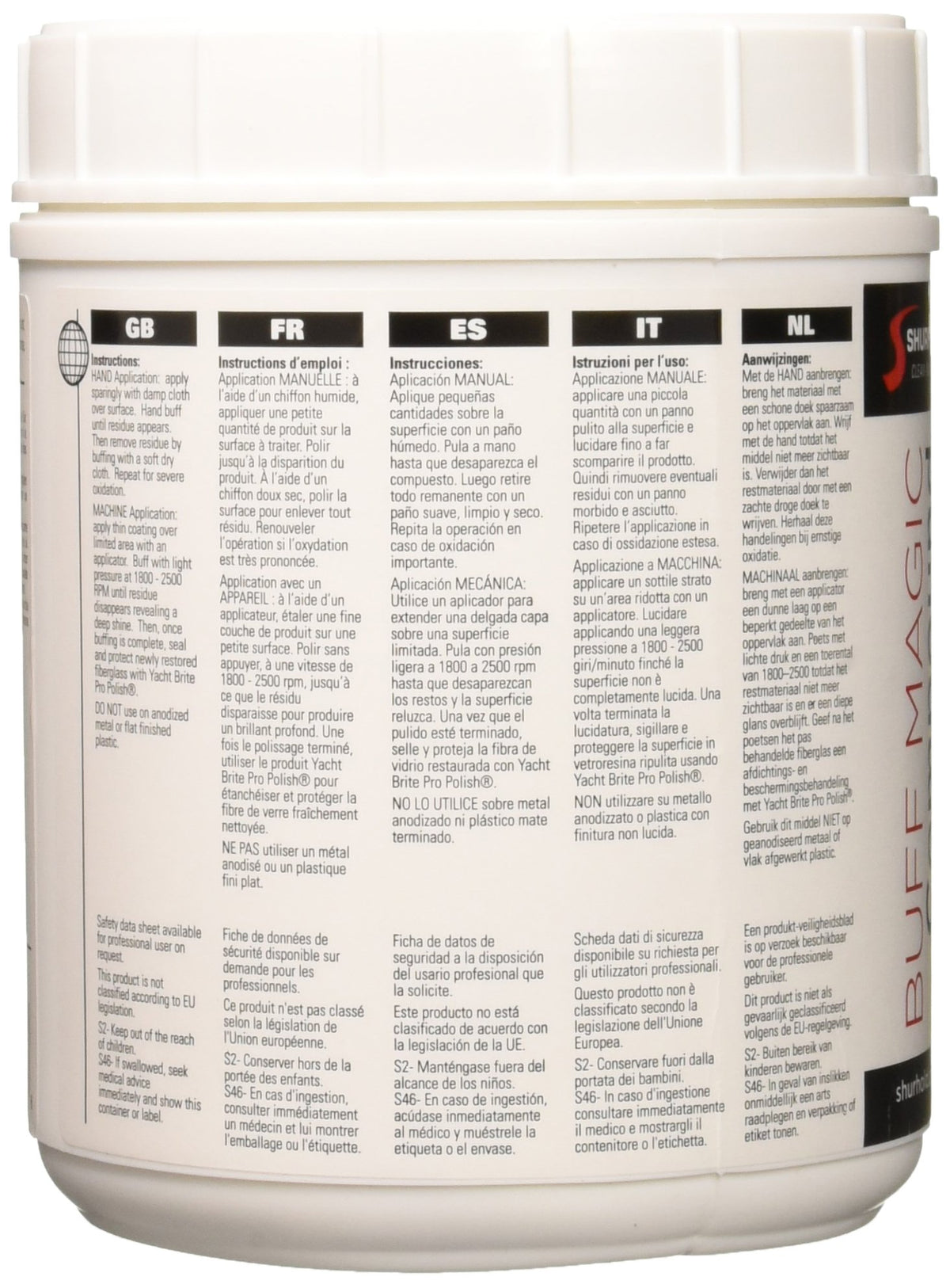 Buff Magic Is Scientifically Formulated With Jeweler'S Rouge To Be A Metal Polish, As Well As A Buffing And Polishing Cream. This Unique Formula Changes As You Use It. With Each Pass Of A Buffer Or Hand Polishing The Proprietary Abrasives In This Compound Break Down Smaller And Smaller. This Effectively Creates A Compound That Can Work Your Finish From Very Dull To Ultra Glossy With Just One Product. Additionally, Since You Do Not Have To Switch Products, This Will Save You Time And Money. Buff Magic Removes: Oxidation, Gel Coat Staining, Surface Rust, Tarnish, Plexi-Glass Scratches, P800 And Finer Da Scratches. Buff Magic Is Perfect For: Boats, Cars, Rv'S, Pots And Pans, Acrylic Tubs And Showers And Much More... Buff Magic Has Been Formulated To Be User Friendly Whether Buffing By Machine Or Hand. It Is Also An Ideal Metal Cleaner And Polisher For Steel, Aluminum, Brass, Bronze, Copper, Gold And Other Precious Metals. Buff Magic Is A Nmma Innovation Award Winner. Instructions: Hand Application- Apply Sparingly With Damp Cloth Over Surface. Hand Buff Until Residue Appears. Then Remove Residue By Buffing With A Soft Dry Microfiber Cloth. Repeat For Severe Oxidation. Machine Application- A 60 Percentage Acrylic/40 Percentage Twisted Wool Pad Is Recommended For Best Results. Never Use A Pad That Already Has Another Chemical On It. Apply A Thin Coating Over Limited Area With An Applicator. Buff With Light Pressure At 1800 - 2500 Rpm Until Residue Disappears Revealing A Deep Shine. Remove Any Excess Residue With Clean Dry Microfiber Cloth. Usage Note: Less Is More With Buff Magic. Since Buff Magic Is Made With High End Materials And No Fillers You Will Need To Apply Less Than You May Be Used To With Other Products. Using To Much Product Will Cause You To Overload The Pad And Have Poor Results. Start With A Small Amount Of Product You Can Always Add More As Needed. Once Buffing Is Complete, Seal And Protect Newly Restored Fiberglass With Pro Polish.