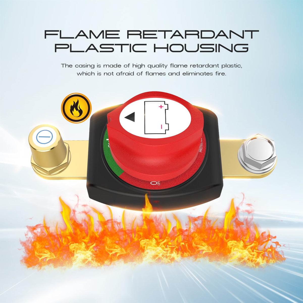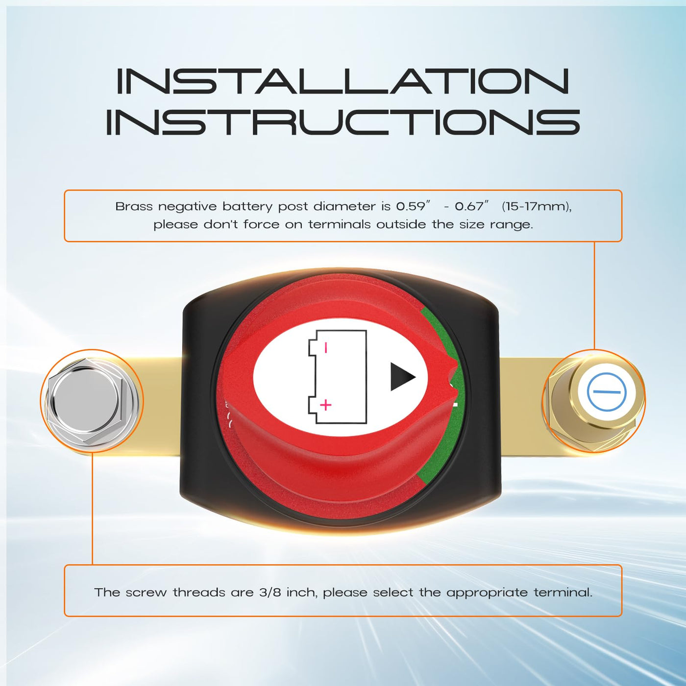 Product Name:Side Post Battery Disconnect Switch 275A Material:High quality ABS plastic and brass Operating voltage:12-48V Working current:275A 1. Designed for DC systems from 12V to 48V, with a simple ON/OFF function. It can sustain a continuous load of 275A at 12V, handle intermittent surges up to 455A, and withstand a peak surge current of 1250A. 2.The no-modification design allows direct attachment to the battery's negative terminal without the need for additional cables or connectors. Enables quick and reliable disconnection of the electrical system. 3.One side is a top post negative terminal and the other side is a 3/8 screw,compatible with most batteries. Please ensure the screw size matches the battery terminals before making your selection. 4.The housing is made from high-quality flame-retardant ABS material, resistant to sparks. The metal connection components are constructed from premium brass, offering excellent durability, conductivity, and extended lifespan. 5.Provides a safe method to disconnect the battery from the electrical system, preventing power drain during vehicle or boat inactivity. Ideal for use in cars, RVs, and marine applications to protect against battery discharge and leakage.
