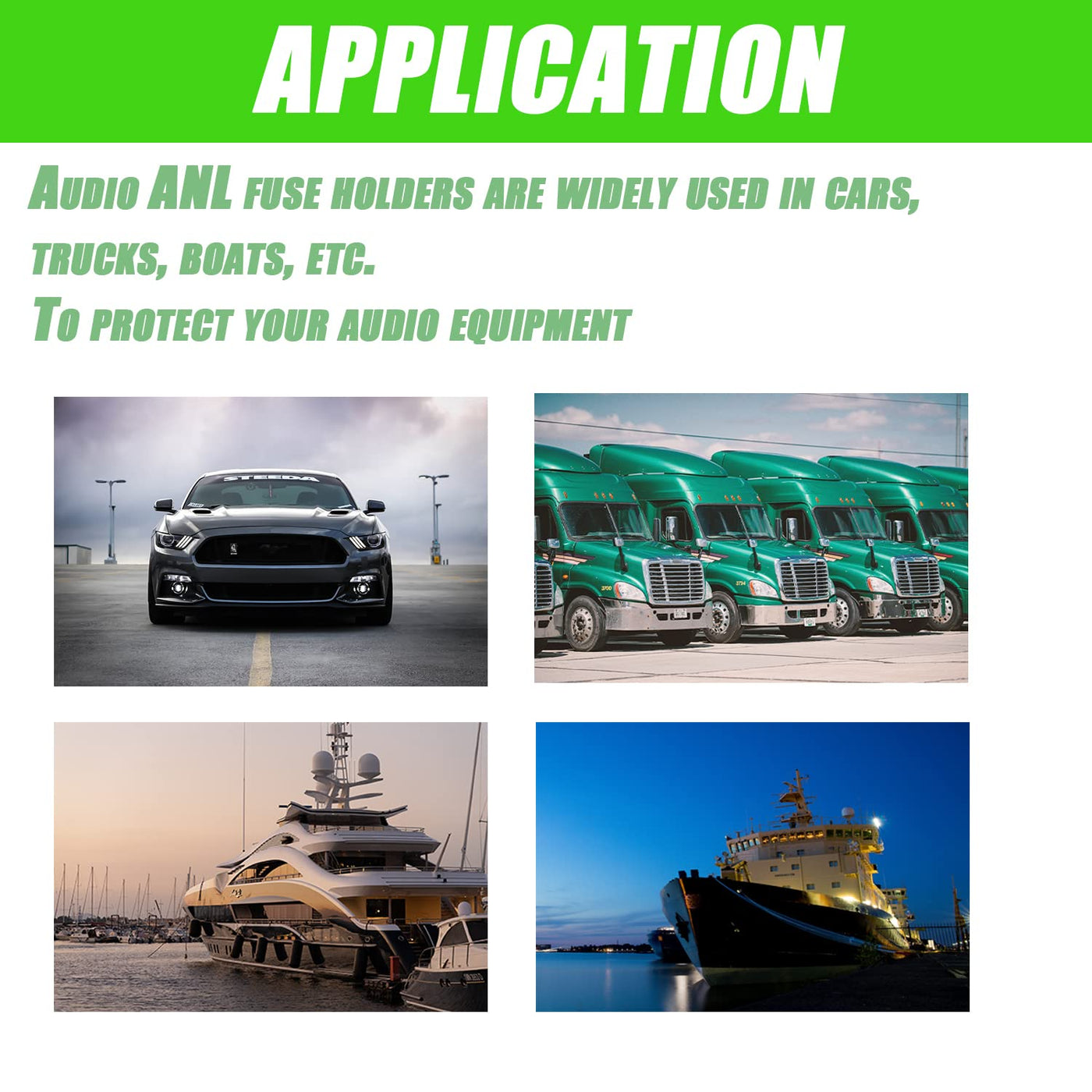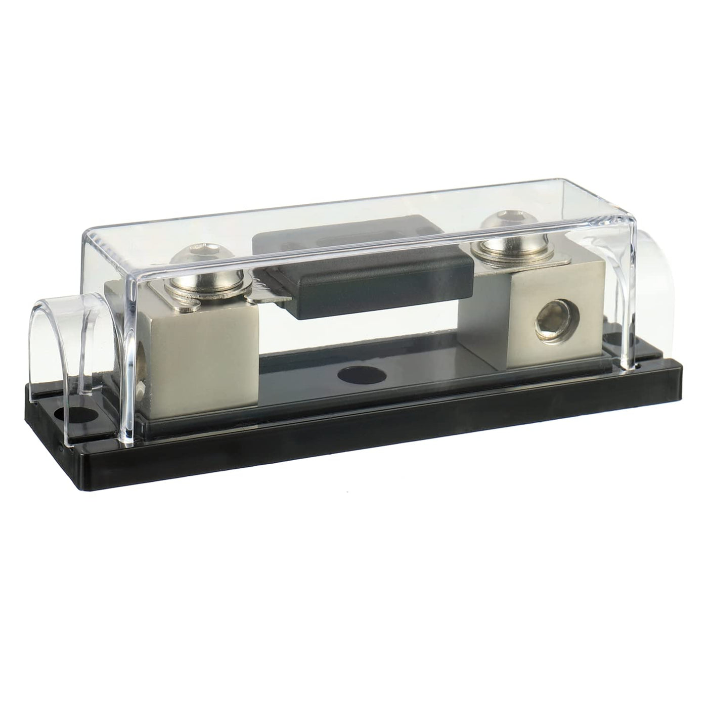SIGANDG In-line ANL Fuse Holder ADVANTAGE Connection without terminal The fuse is highly conductive and heat resistant Base and cover are high temperature resistant and insulating Screws hold the fuse securely With 2 screw holes for secure mounting APPLICATION Audio ANL fuse holders are widely used in cars, trucks, boats, etc. To protect your audio equipment WIRING SPECIFICATIONS The wiring cable for the fuse holder is for wire gauge 0, 2, 4, AWG cables. PACKAGE 1*fuse holder 1*200A Blade Fuse