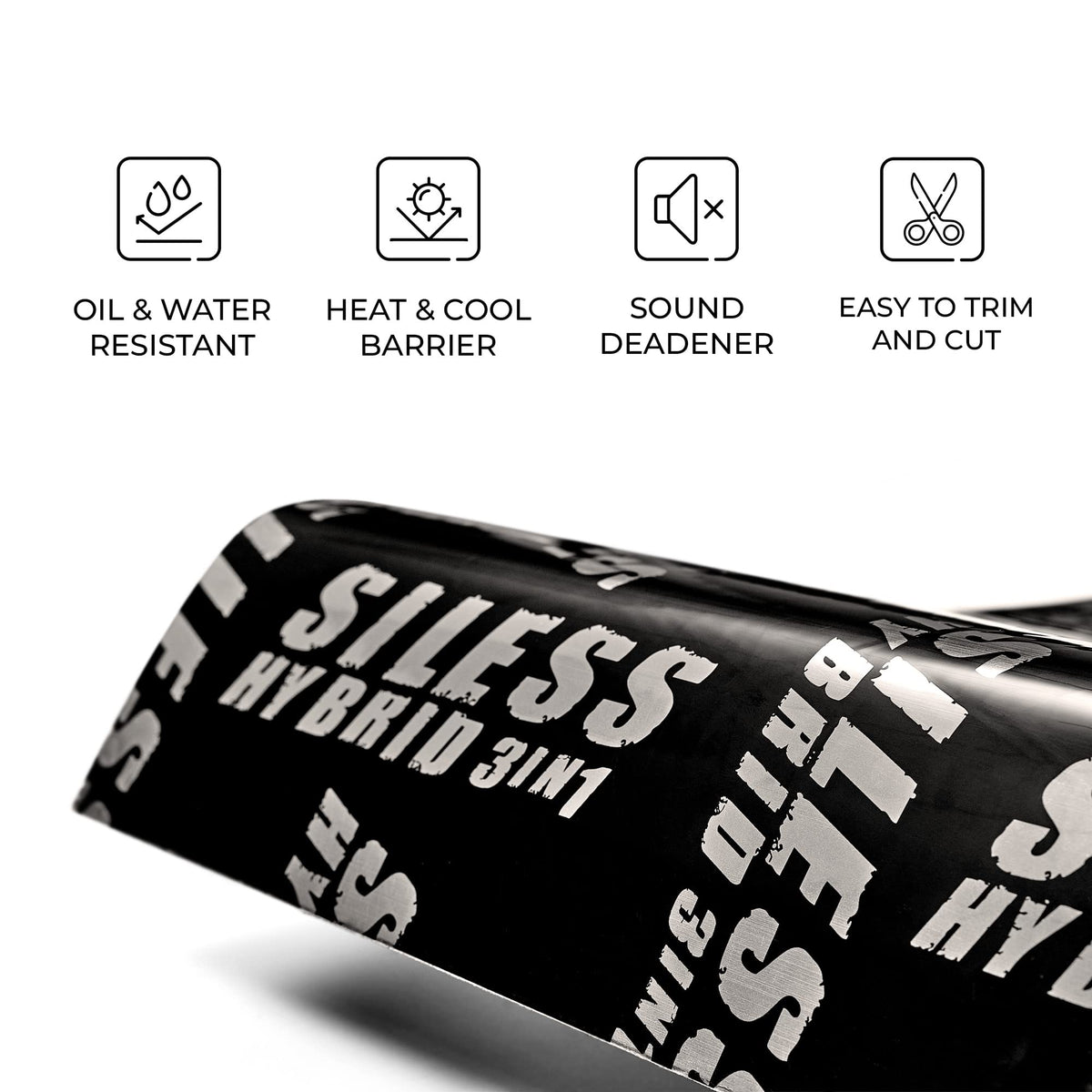 Q: What is Siless Hybrid 3in1 and how does it work for sound deadening?A: Siless Hybrid 3in1 is a heavy-duty sound deadening mat made from a composite barrier of Butyl Mastic, Pe Foam, and Mass Loaded Butyl Membrane. It effectively dampens sound vibrations, reduces low frequency exhaust noise, and acts as a heat barrier, making it ideal for automotive soundproofing.