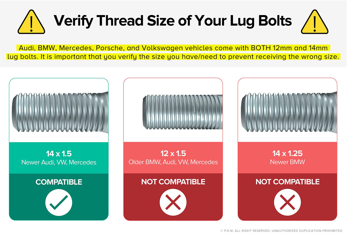 [ Fitment ] Meant To Be Used On Vehicles With 14X1.5 Thread Lug Bolts. Compatible With Audi: 1989-1994 100, 2012-2019 A3, 2007-2019 A4, 2011-2018 A6, 2016-2018 A7, 2010-2016 A8 Compatible With Audi: 2013-2019 S3, 2005-2019 S4, 2008-2019 S5, 2019-2020 S6, 2013-2020 S7, 2012-2018 S8 Compatible With Audi: 2014-2018 Tt, 2014-2019 Q3, 2009-2019 Q5, 2007-2019 Q7, 2008-2020 R8, 2017-2019 Rs3, 2014-2018 Rs7, 2014-2019 Sq5 Compatible With Volkswagen: 2011-2019 Beetle, 1992-2004 Eurovan, 2007-2016 Eos, 2008-2020 Golf, 2006-2014 Gti Compatible With Volkswagen: 2000-2020 Jetta, 2012-2020 Passat, 2006-2009 Rabbit. Compatible With 2009-2019 Tiguan [ Important Notes ] - Be Aware That Certain Years / Models / Trims Use Different Threaded Bolts. Do Not Go Strictly By Vehicle Make. - If You Are Not Sure Of Your Vehicle'S Lug Bolt Size, Please Send Us An Amazon Message With The Year/Make/Model. Click The &Quot;European Motor Werke&Quot; Link Under The Delivery Options. Click The &Quot;Ask A Question&Quot; Button. Please Be Sure To Include The Asin Of This Item In Your Message. [ Installation Instructions ] 1) Screw It Into One Of Your Lug Holes At Or Near The 12 O'Clock Position 2) Put Your Wheel On.&Nbsp; The Wheel Hanger Will Go Through One Of Your Wheel'S Lug Holes 3) Tighten Your Wheels Using Your Other Lug Bolts 4) Take The Wheel Hanger Off 5) Install The Last Lug Bolt 6) Torque The Lug Bolts In A Star Pattern Using Factory Torque Specs