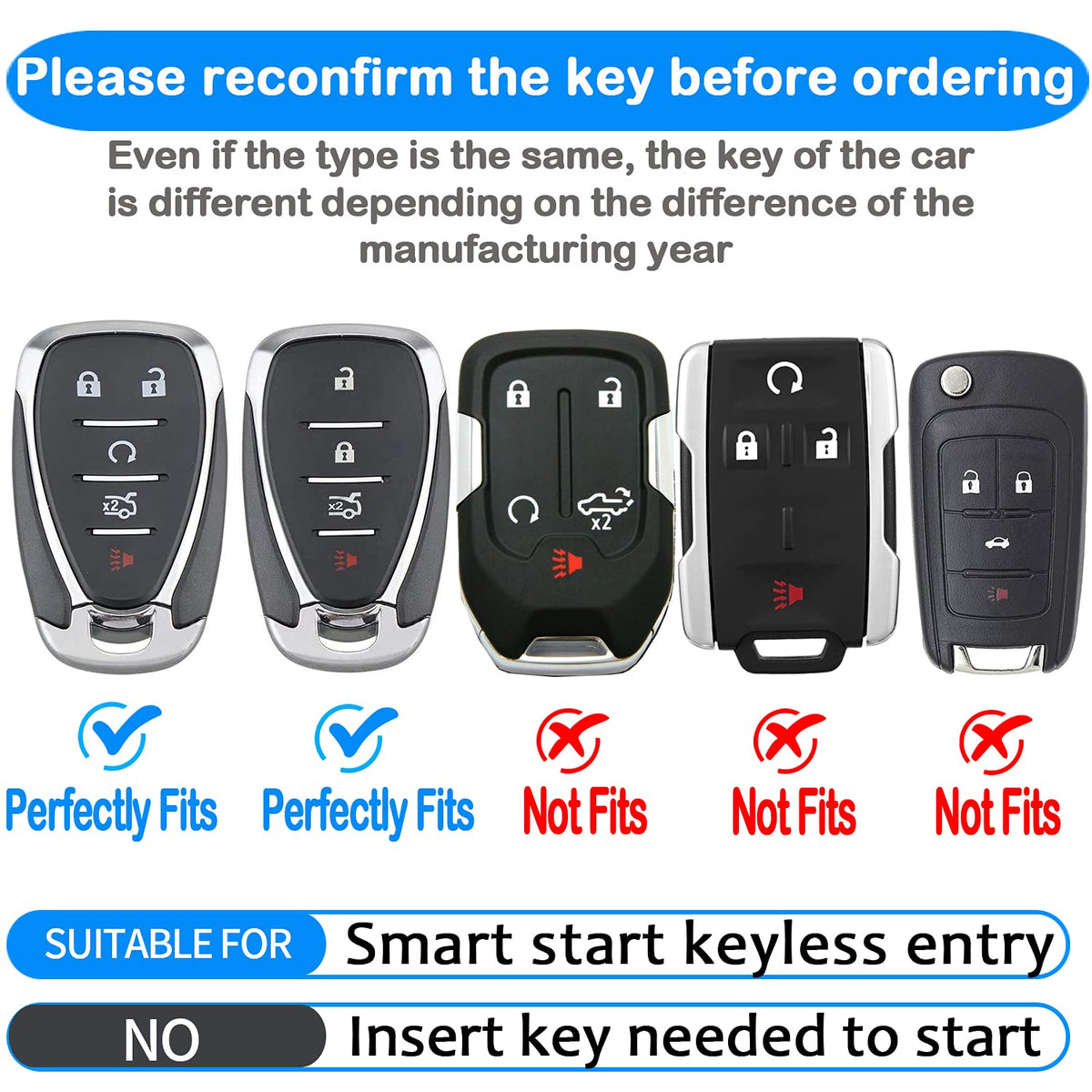 Fits models:Compatible with 2017 2018 2019 2020 2021 Chevy Malibu Camaro Cruze Traverse Spark Sonic Encore Trax Volt Bolt Equinox 3/4/5 buttons Smart Key remote control. | Note: Even though the car model is the same, but the car key might be different based on the different year of manufacturing, so please Double Check your Key Fob with the picture at left before Purchasing | Material: Keychain Made With Premium Leather and Metal Key Cover Made with premium TPU. Super thin, soft, trending looking and pretty durable. Make your key fob look new and premium | 360 Degree protection: Full protection of back and forth, left and right. It can effectively protect your car key from falling, shock, scratch and dust | After-sales:Unconditionally refund or free replace if any defective or quality problems, any problem please feel free to contact us, we offer life-time friendly customer service.