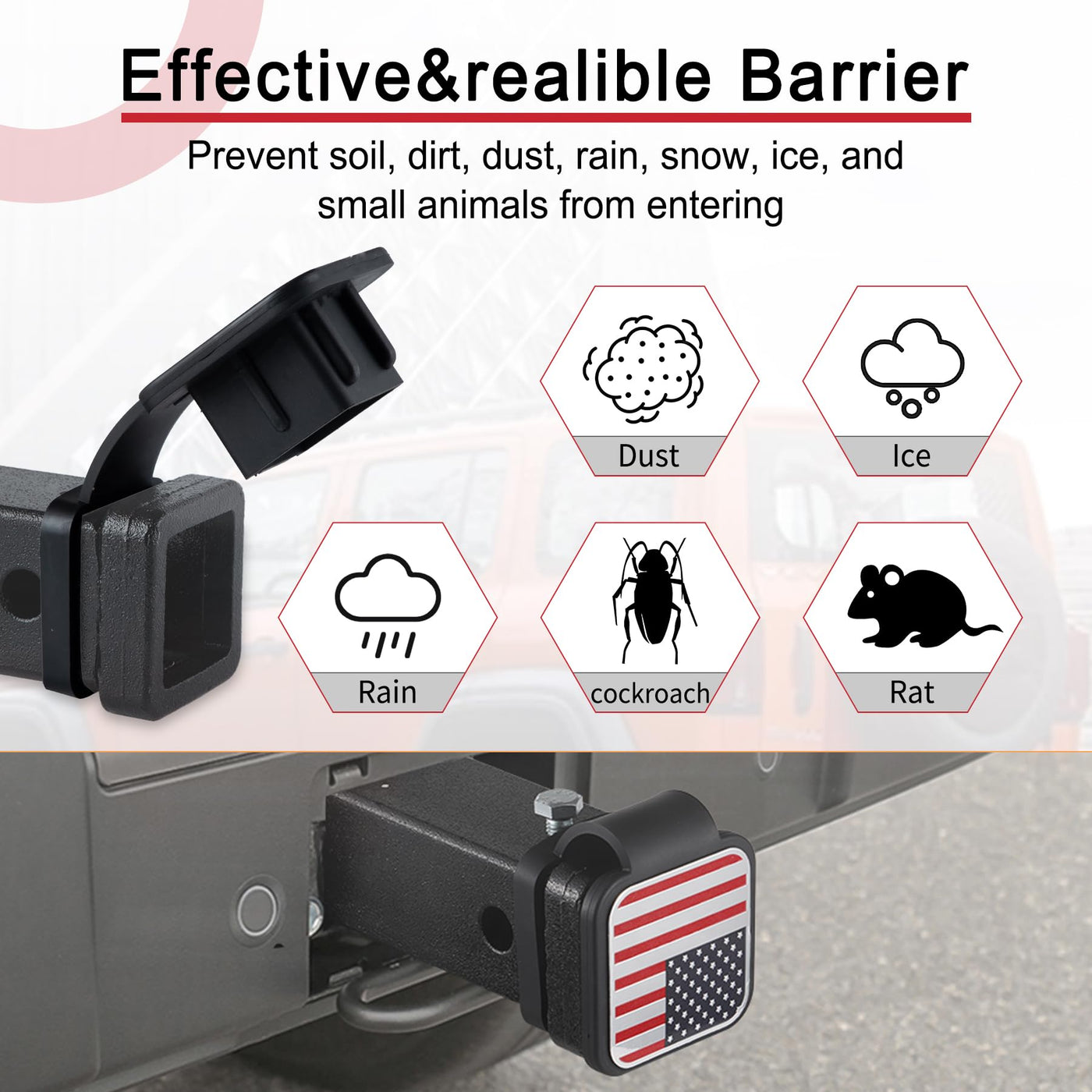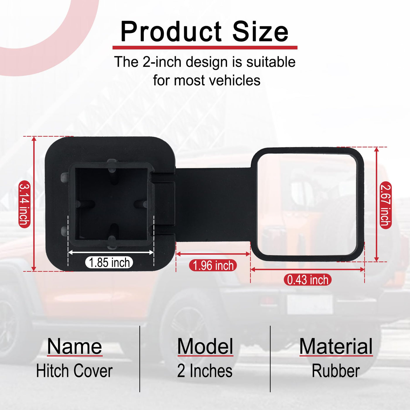 Q: What is the purpose of using a tow hitch cover?A: A tow hitch cover serves multiple purposes: it keeps mud, dirt, dust, rain, snow, and small animals out of the receiver tube, preventing rust and damage, while also adding a stylish touch to your vehicle.