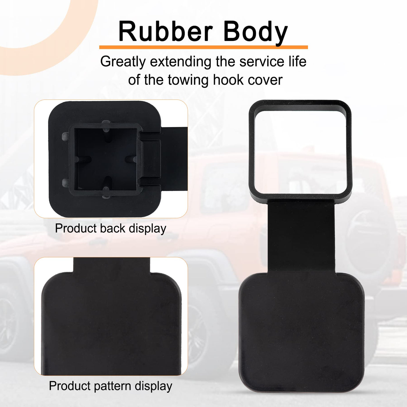 Q: What materials are used in the SINGARO hitch cover?A: The SINGARO hitch cover is made of high-quality black soft rubber and aluminum sheets, ensuring durability and resistance to extreme weather conditions. This construction significantly extends the life of the tow hook cover.