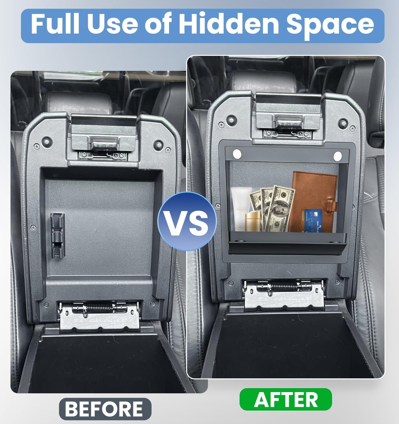 Q: Can I use the hidden storage box for securing valuable items?A: Yes, the center console hidden box provides a private storage space where you can securely store cash, cards, insurance policies, and other valuable items. This feature optimizes wasted space in your Tacoma's armrest box.