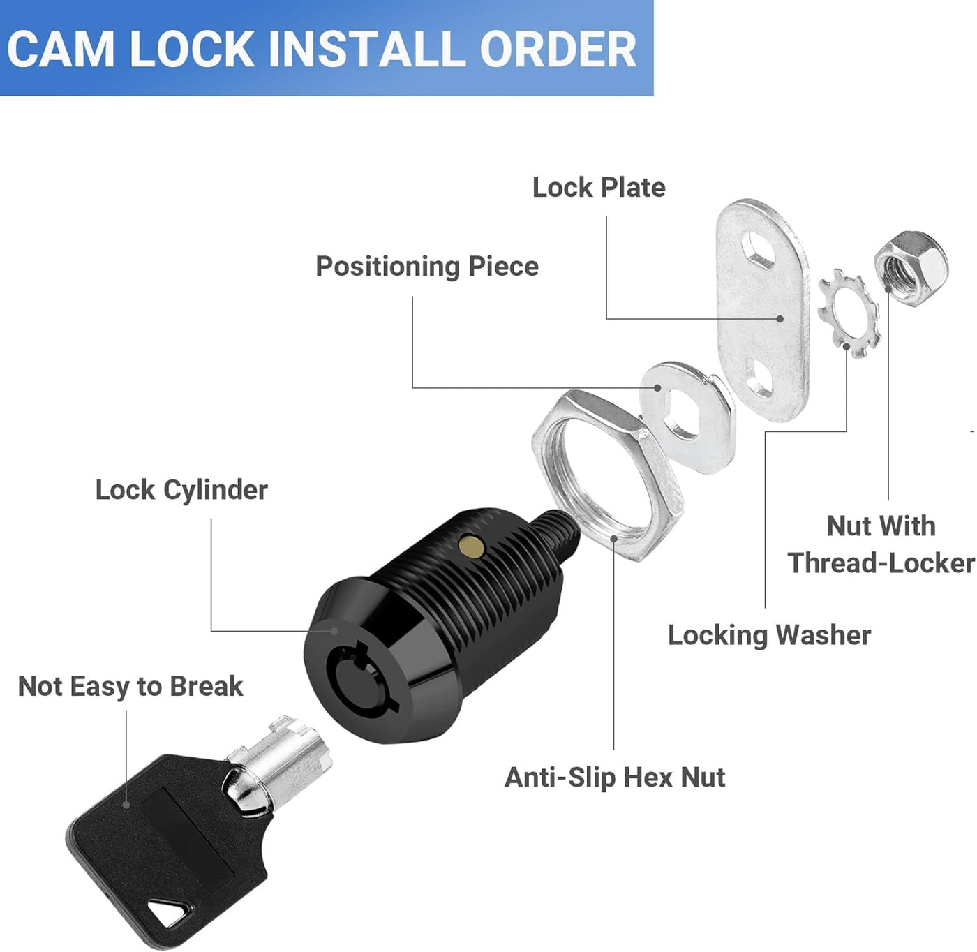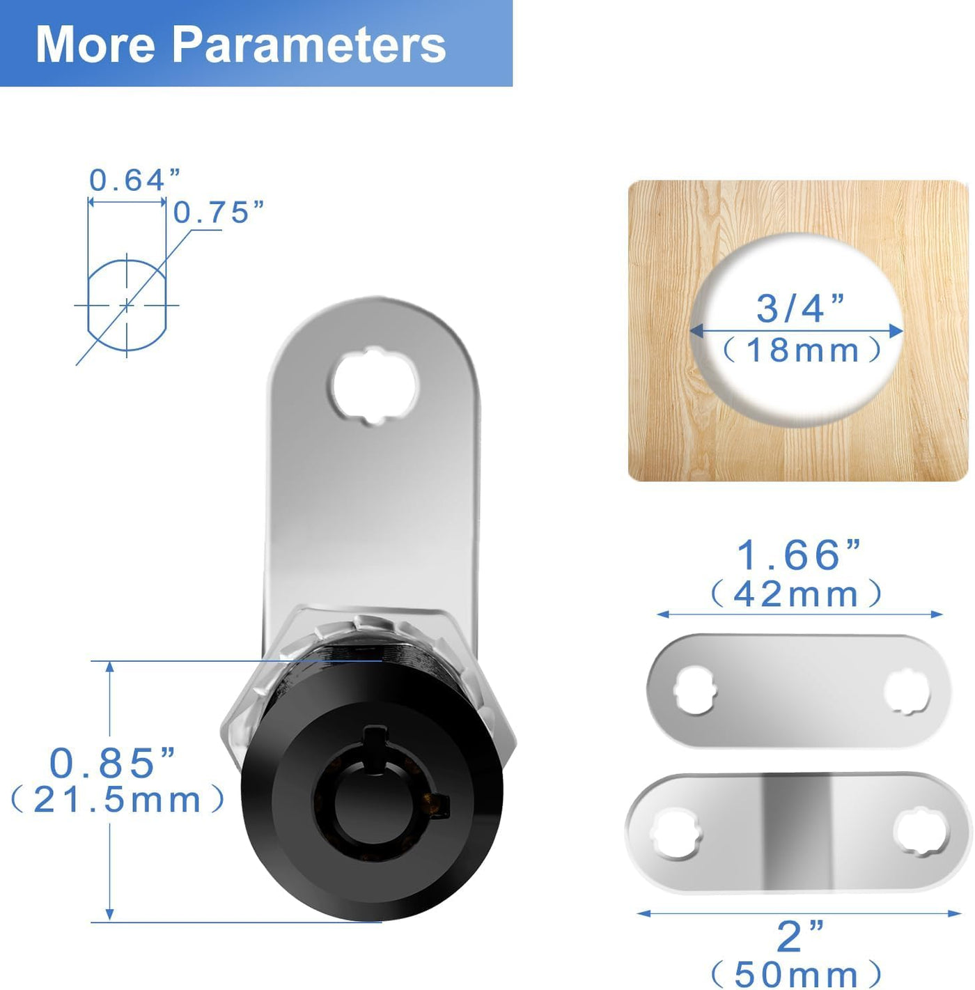 Sissinda RV Storage Door Locks specialize in keeping your valuables safe and private, help you travel worry free with loved ones! Our RV storage tubular lock body is made of high-quality zinc alloy die-casting and black-plated, which is strong, rust-proof and durable.Can be widely used as replacement locks in RVs, campers, desks, drawers, cabinets, tool boxes, etc.Specification: Material: Zinc Alloy, Matte Black Finish Rotation Angle: 90 degreeFor Door Thickness: Less than 9/16 inch( about 14.2mm) Mounting Hole Diameter: about 3/4 inch (about 19mm)Max. Latching Distance: 7/8 inch(22.3mm)Offset Cam Length: 1.62inch ( 41mm) Straight Cam Length: 1.89 inch (48mm) Easy to Install: Can be mounted to metal or wood, cabinet/drawer doors in multiple positions (at the 3, 6, 9, or 12 o'clock position with a 90 degree turn)by adjusting the installation direction of the positioning piece and lock plate. Package Included: 6 x Tubular Cam Locks sets , 12 x Keys, (Keyed Alike), Key alike means one key is able to open all the locks in the same set. 100% Satisfaction Guranteed: If you are not satisfied with the product, we provide a full money back guarantee. If you need any support, please feel free to contact us. Kindly Note: We provide 1-1/8 , 1 , 7/8 and 5/8'' tubular cam locks. Please refer to picture 2, check before purchase to make sure dimensions fit your application.