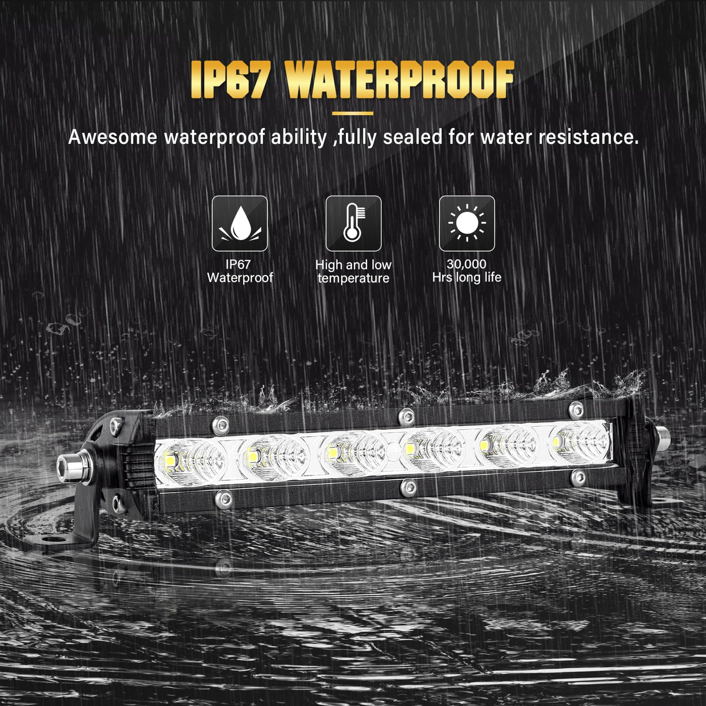 Specifications: LED Power: 30W (6 x 5W/pcs High Intensity LEDs) Beam Pattern: Flood Beam (Best choice as Fog lights) Operating Voltage: 10-30V DC(Fit 12V,24V Vehicles,Cars,Trucks ect.) Lifespan: 30,000 hours above Waterproof Rate: IP67 Color Temperature: 6000K Lumen: 3000LM Features: -Die-cast Aluminum Alloy Housing -Waterproof,dustproof,quakeproof, anti-explosion -Valid irradiation distance longer than normal bulb -Upgrade PC lens surface with high light transmission -Adjustable Mounting Brackets,easy to install Applications: Off-Road Vehicles: UTV, sand rail, buggy, ATV, SUV, truck, train, motorbike, bus, tank etc. Engineering Vehicles: excavator, Dozer ,road roller, Tractor , Harvester , Grain Drill , Mower , Snowplow ,bulldozer, crane, fork lift and mining truck etc.; Specialized Vehicles: fire engine, police car, rescue vehicle, Camping, Construction Lighting ,communication vehicle, military command vehicle etc. Others: boat, fishing, courtyard lamp, yacht, road/ street lamp, etc. Household Lighting: Garden, Backyard, Garage, Indoor Lighting. (Note: Use a voltage transformer/converter to convert the AC 110-120V to DC 12V/24V for indoor use.) Package Content: 2 x 7 inch LED light bar 2 x Mounting Bracket Note: They are aftermarket parts. NOT D.O.T. approved. Do not use if D.O.T. is required. For off road use only. Before installing this product, please check your state/provincial and local/municipal laws and regulations. The reason WHY choosing us - Perfect quality and unique design. - Waterproof and anti-corrosion. - Eco-friendly and heat dissipation. - Fit for off road, Truck, Power Sport, ATV, UTV, SUV - Warmly customer support.