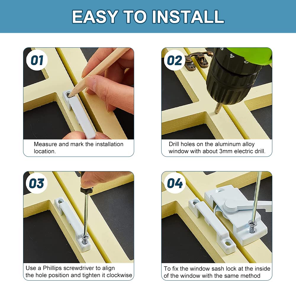 Q: How do I install the sash locks on my windows?A: To install the sash locks, drill holes in the edge of the window with a 3mm electric drill, ensuring the distance between the centers of the holes is 2.08 inches. Use the included stainless steel screws to attach the locks securely to your window frame.