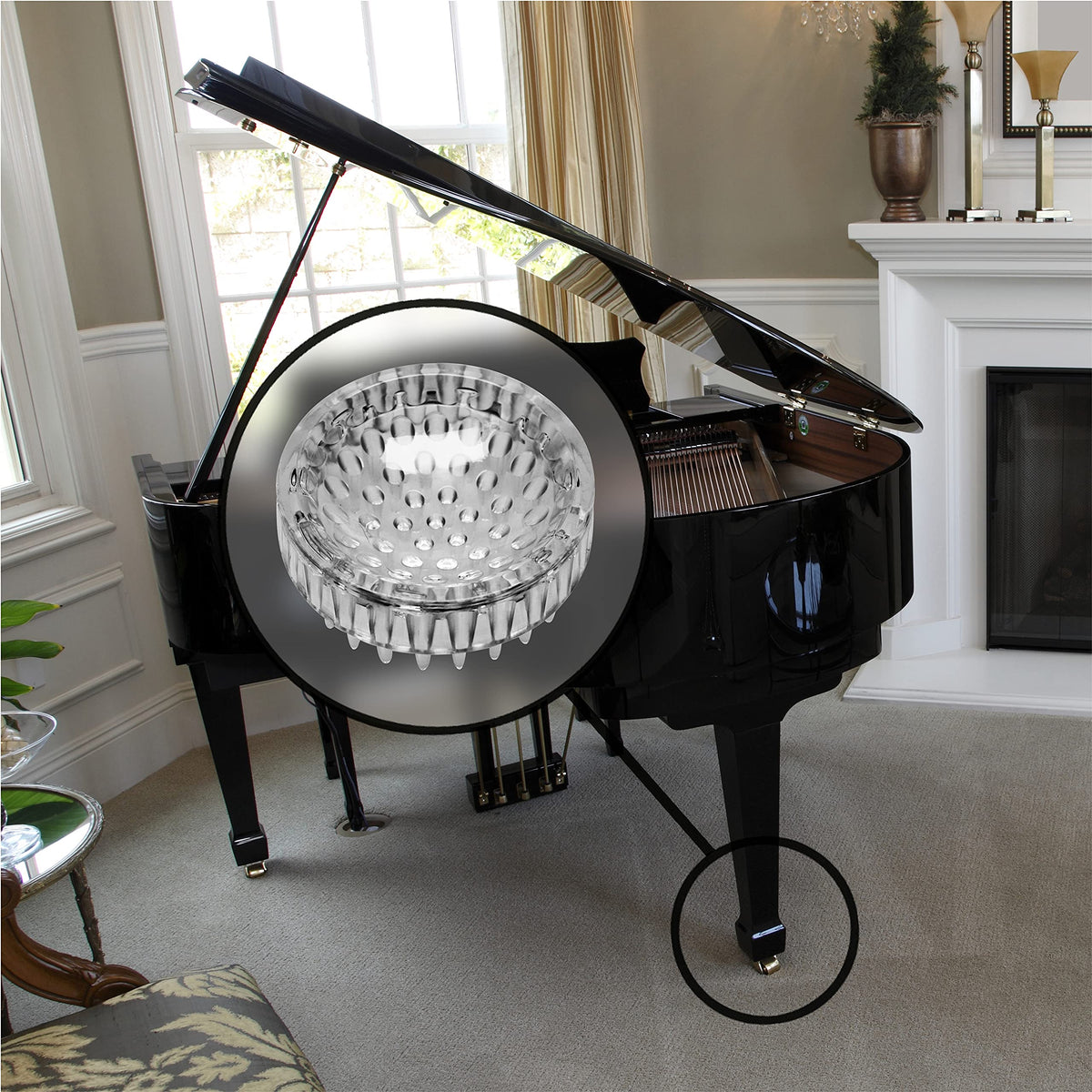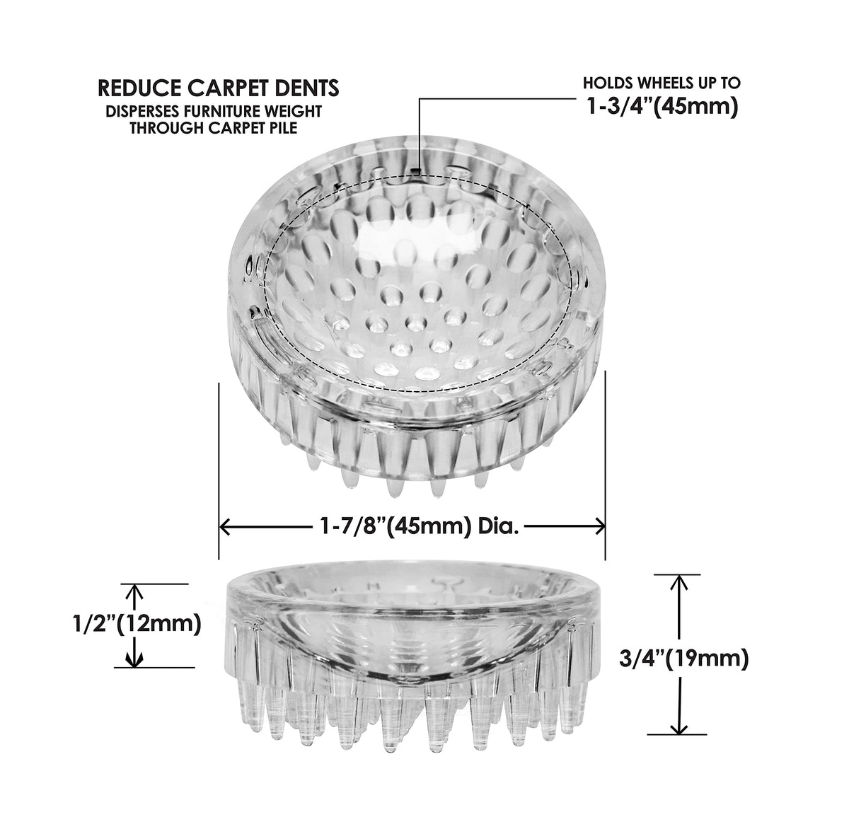 A uniquely designed yet straightforward answer to pointy, thin legs or metal furniture wheels. Lock them in place with zero installation time required. Heavy-duty, see-through plastic is virtually invisible beneath your furniture, and the sturdy matrix of pins holds the cup snugly in place on carpet without denting, damaging or digging into the pile. Each caster cup supports up to 330 pounds (this set of 4, therefore, can hold up to 1,320 pounds).