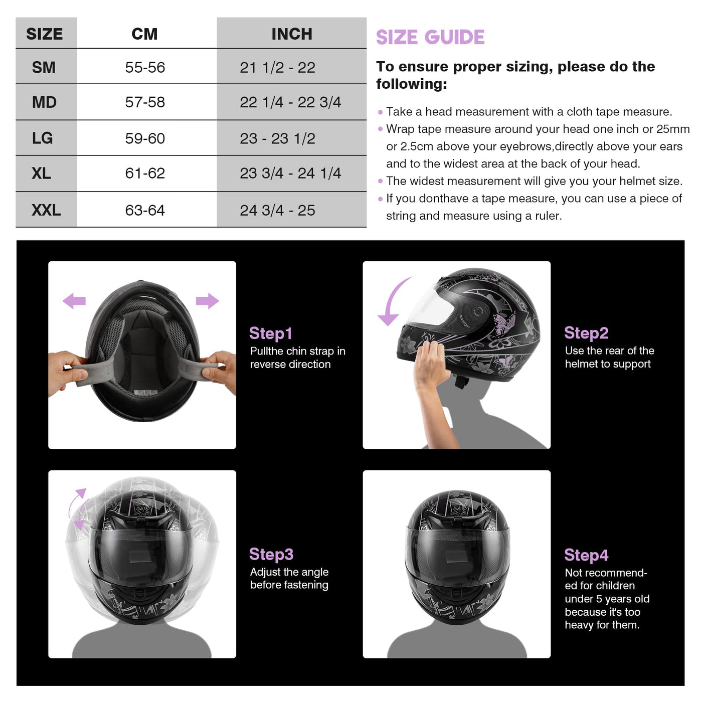 Feature: DOT safety standard Beautiful glossy UV protective finished New style design will make you look so cool and fashionable Well vented all purpose product for summer or winter riding and off-road riding S/M/L/XXL size For Adult: 【Sm Centimeter: 55-56CM=21 1/2 - 22inches; Hat Size :6 7/8 - 7inches 】; 【Md Centimeter: 57-58CM=22 1/4 - 22 3/4inches; Hat Size :7 1/8 - 7 1/4inches 】; 【Lg Centimeter: 59-60 CM=23 - 23 1/2 inches; Hat Size :7 3/8 - 7 1/2inches】; 【XL Centimeter: 61-62CM=23 3/4 - 24 1/4 inches; Hat Size: 7 5/8 - 7 3/4inches】;