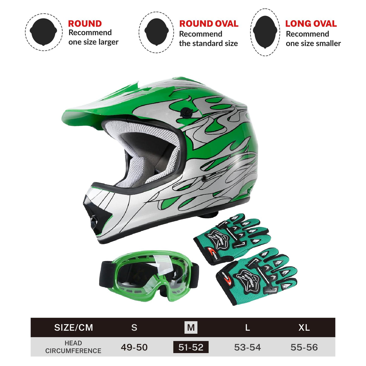 Slmoto Dot Youth Kids Helmet Motocross Offroad Street Helmet Motorcycle Helmet Dirt Bike Motocross Atv Green Flame Design Helmet+Goggles+Gloves