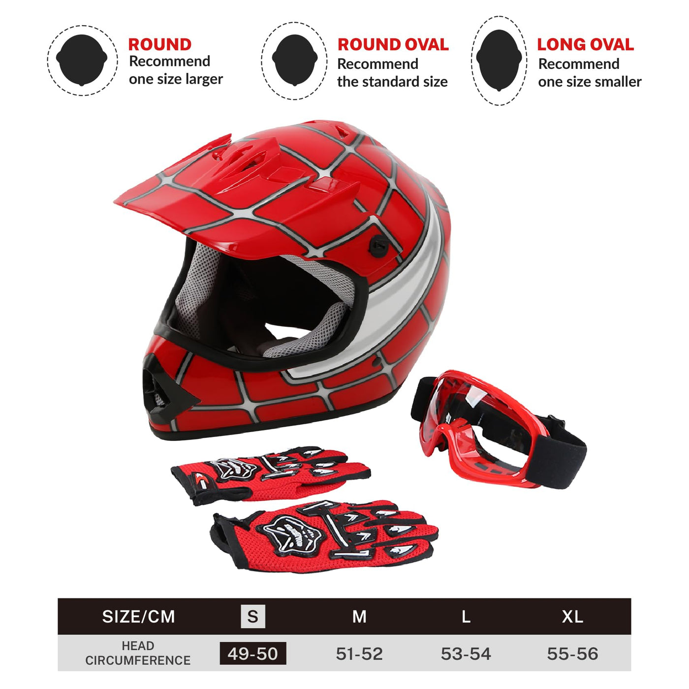 Fitment: DOT safety standard Beautiful glossy UV protective finished New style design will make you look so cool and fashionable Well vented all purpose product for summer or winter riding and off-road riding The motorcross helmet comes with goggles and gloves, it could provide all-around protection to you Patterns: Pink Butterfly, Blue Flame, Green Flame, Blue Skull, Black Skull, Red Spider Helmet Size: Small/Medium/Large/X-Large (Youth) Helmet Size: S; Child(cm): 49-50; Inches: 19.28''-19.68''?;?Helmet Size: M; Child(cm): 51-52; Inches: 20.07''-20.47''?;?Helmet Size: L; Child(cm): 53-54; Inches: 20.86''-21.26''?;?Helmet Size:XL; Child(cm): 55-57.15; Inches: 21.65''- 22.5''? Goggles Size: One Size(Youth) Gloves Size: One Size(Youth) Package Included: 1x Motorcross Helmet 1x Motorcross Goggles 2x Motorcross Gloves 1x Helmet Bag Note: Please measuring your head before bidding.Take a head measurement with a cloth tape measure. Wrap tape measure around your head one inch or 25mm or 2.5cm above your eyebrows,directly above your ears and to the widest area at the back of your head. The widest measurement will give you your helmet size.