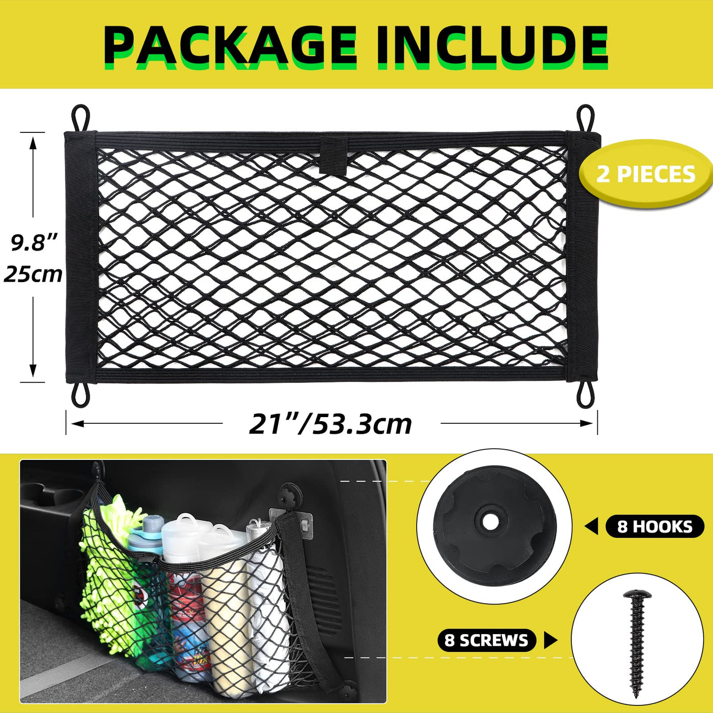 High elastic mesh, large storage capacity because of strong scalability with good recovery!The stretchable net allows you to store several item, such as toys, games, groceries, bags, dog supplies, cleaning agents, booster cables etc.