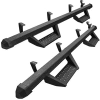 Q: What material are the SMANOW Running Boards made of?A: The SMANOW Running Boards are constructed from heavy textured powder finish coated carbon steel, providing durability and resistance against wear and tear.