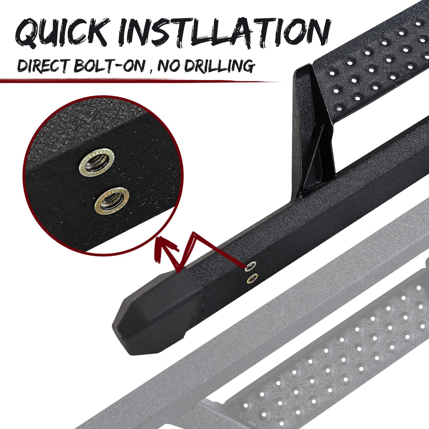 Q: Is installation of the SMANOW Running Boards difficult?A: No, the installation of the SMANOW Running Boards is straightforward and does not require any drilling or modifications. The package includes two steps (one left and one right), along with all necessary mounting brackets and hardware.